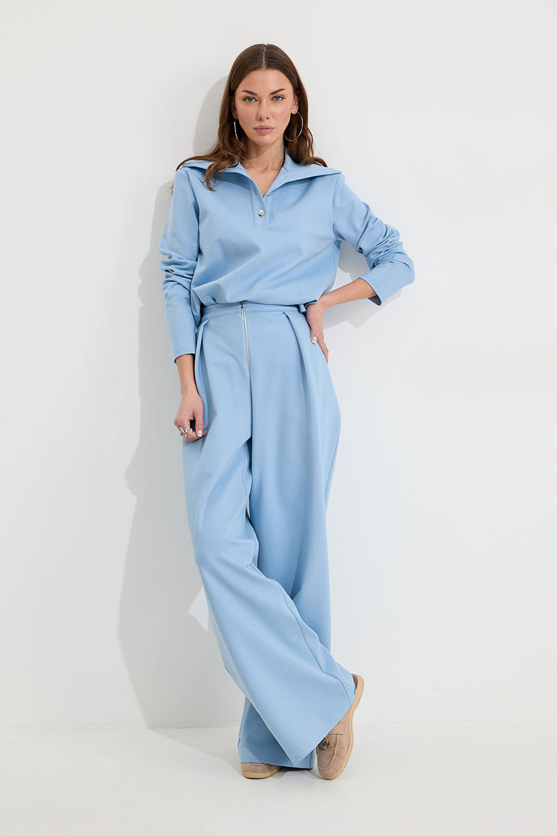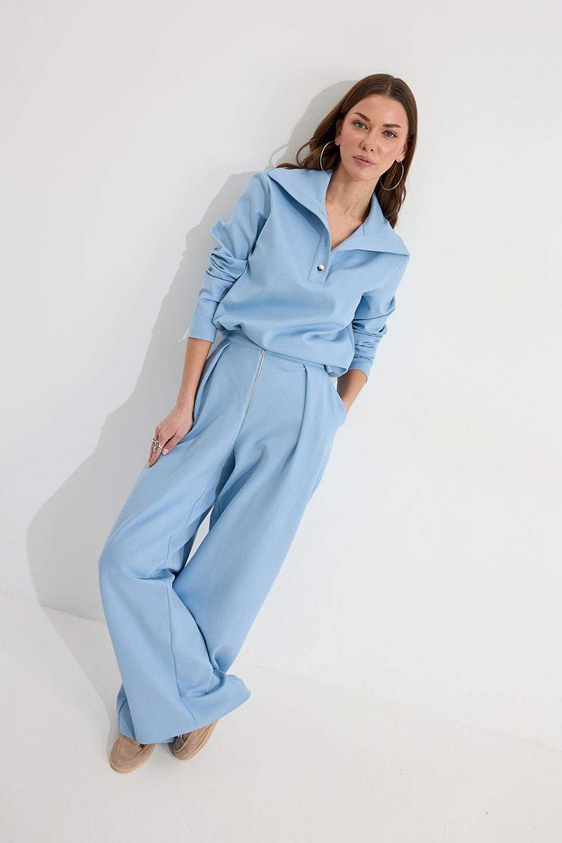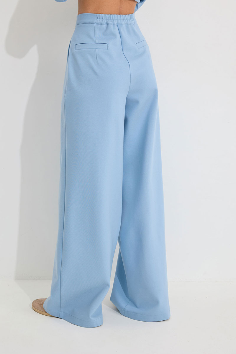 Брюки прямого силуэта из трикотажного полотна. По верху брюк притачной пояс, по переду застежка молния в среднем шве, карманы в боковых швах и декоративные складки. На задних половинках брюк прорезные листочки. По задним половинкам брюк на поясе резинка от вытачки до вытачки.