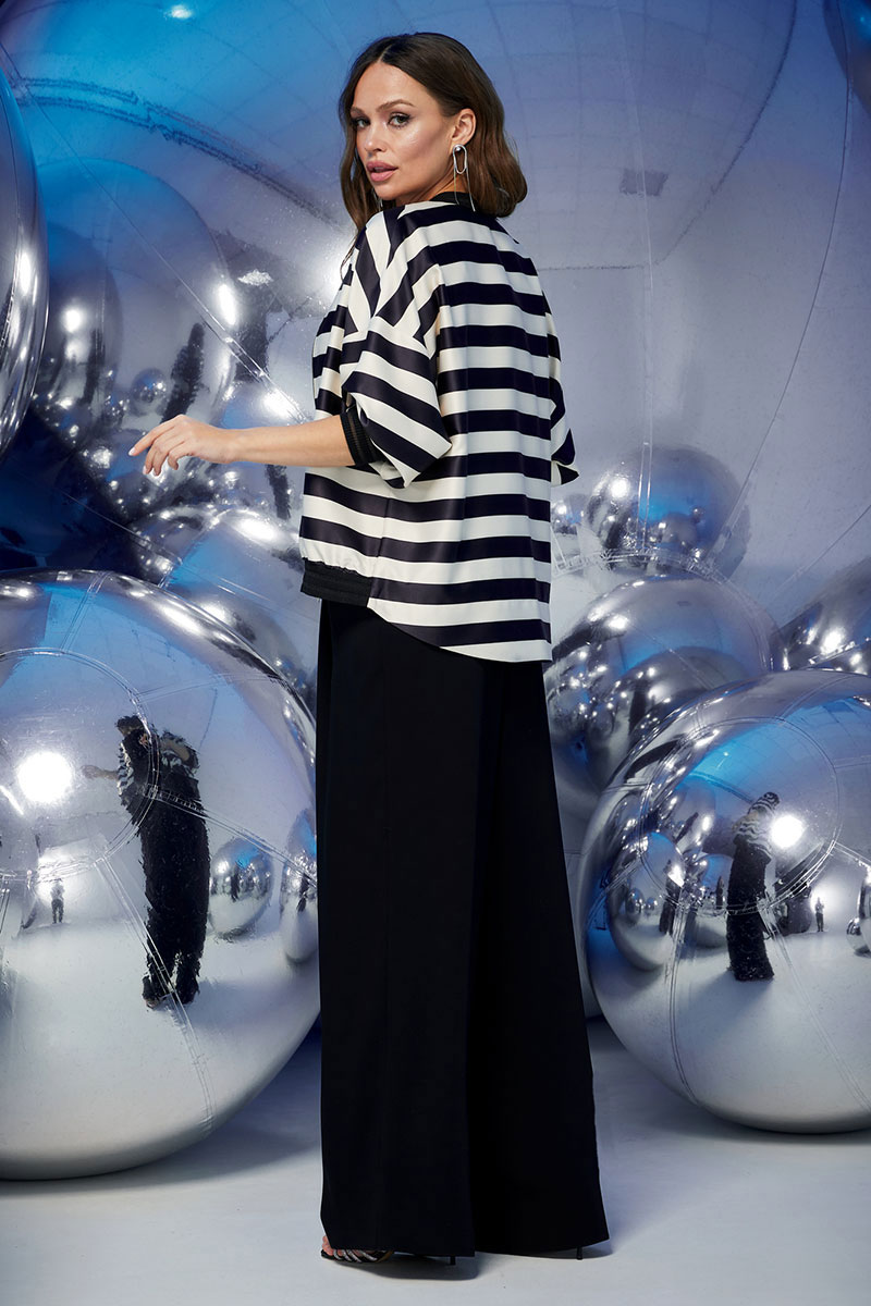 Бомбер свободного кроя с центральной застежкой металлическую молнию. Выполнен из плотной блузочной ткани. Рукав длинный, дополнен притачной манжетой. Спинка блузы длиннее.