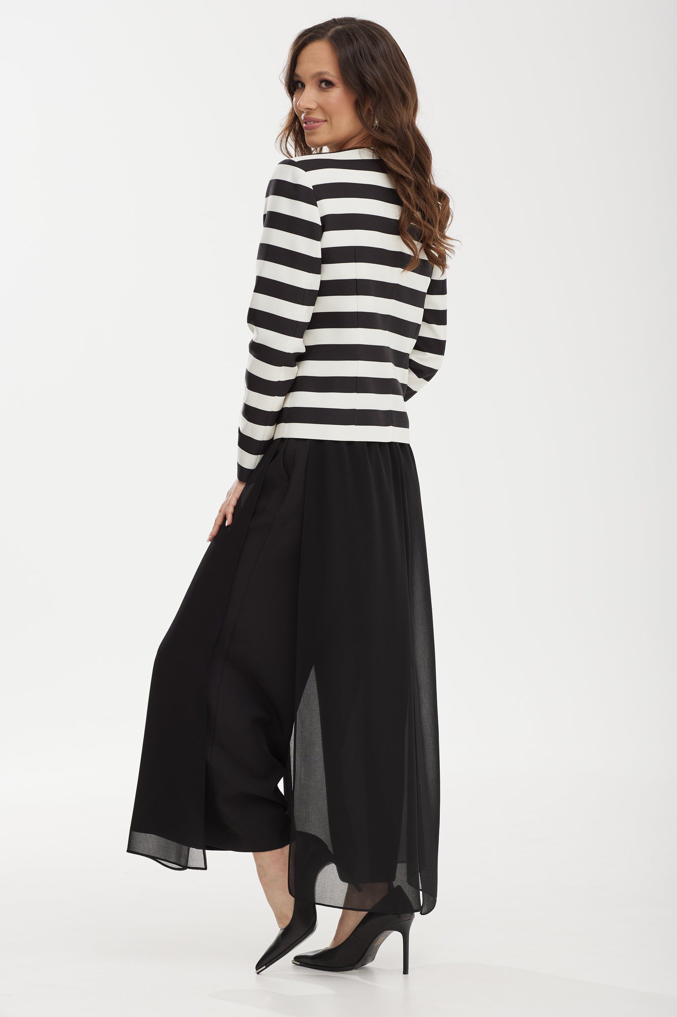 Нарядный комплект из жакета и брюк. Двубортный жакет полуприталенного силуэта, на подкладке. Рукав длинный, втачной. Центральная застежка на красивые пришивные пуговицы. Брюки кюлоты прямого кроя с притачным поясом, дополненным эластичной тесьмой. Застежка гульфик на пуговицу и молнию. Брюки дополнены удобными боковыми карманами. Неповторимый шарм брюками придают элементы из шифона, которые закреплены по шву пояса и свободно и эффектно развеваются при движении и ходьбе.