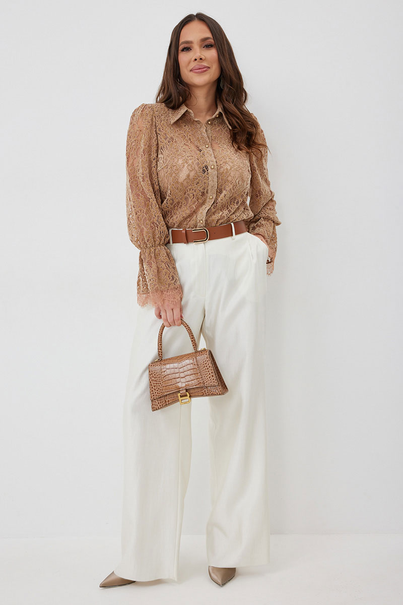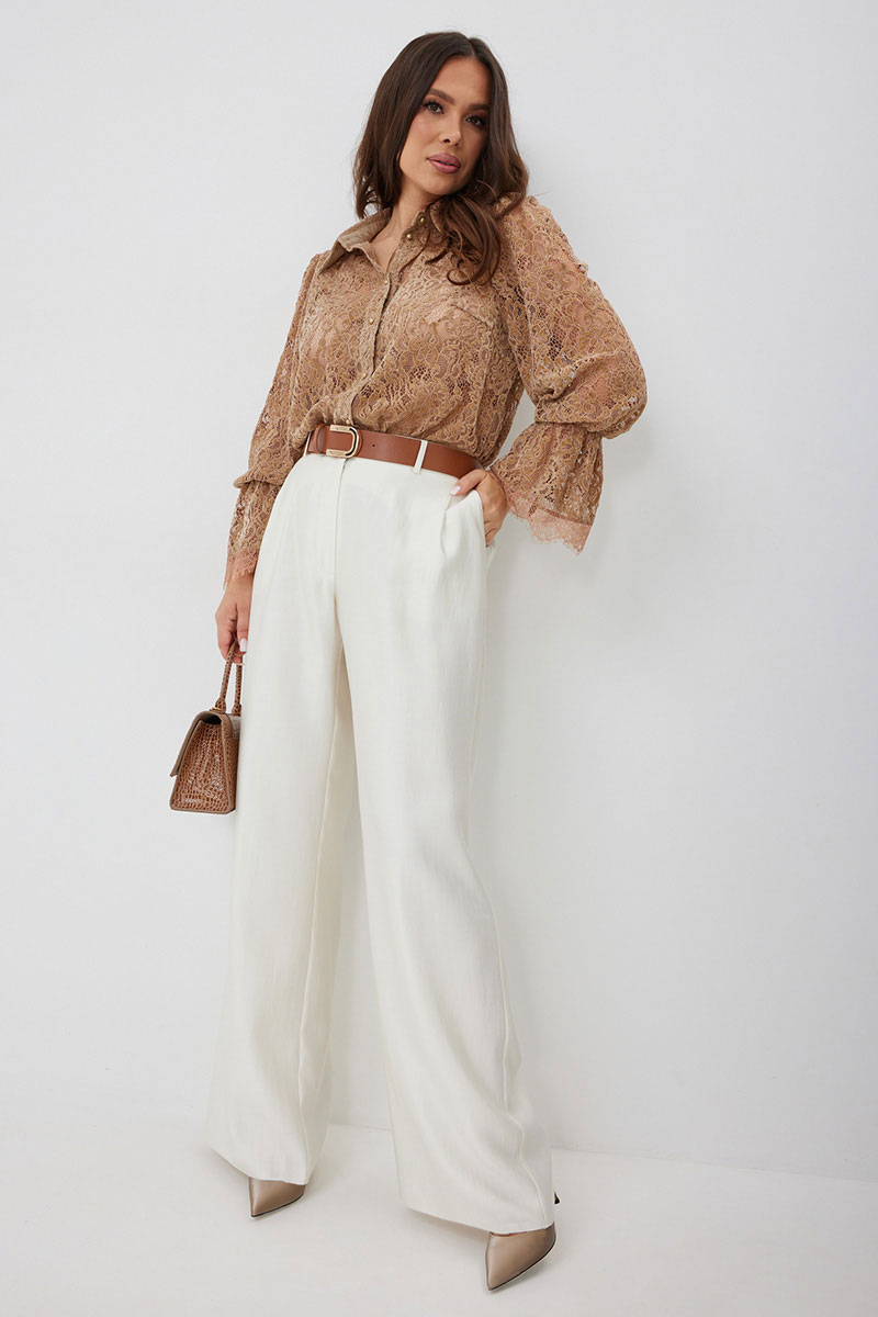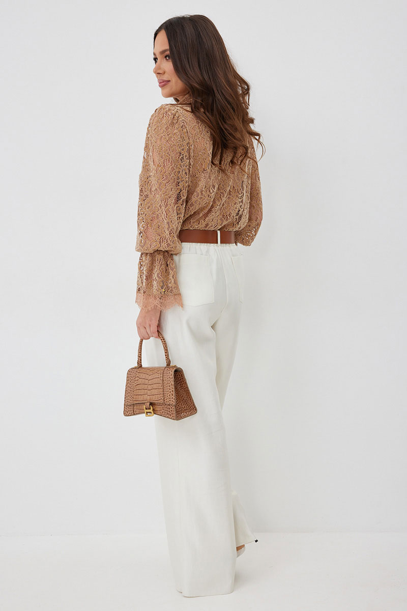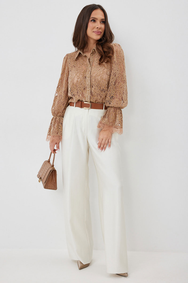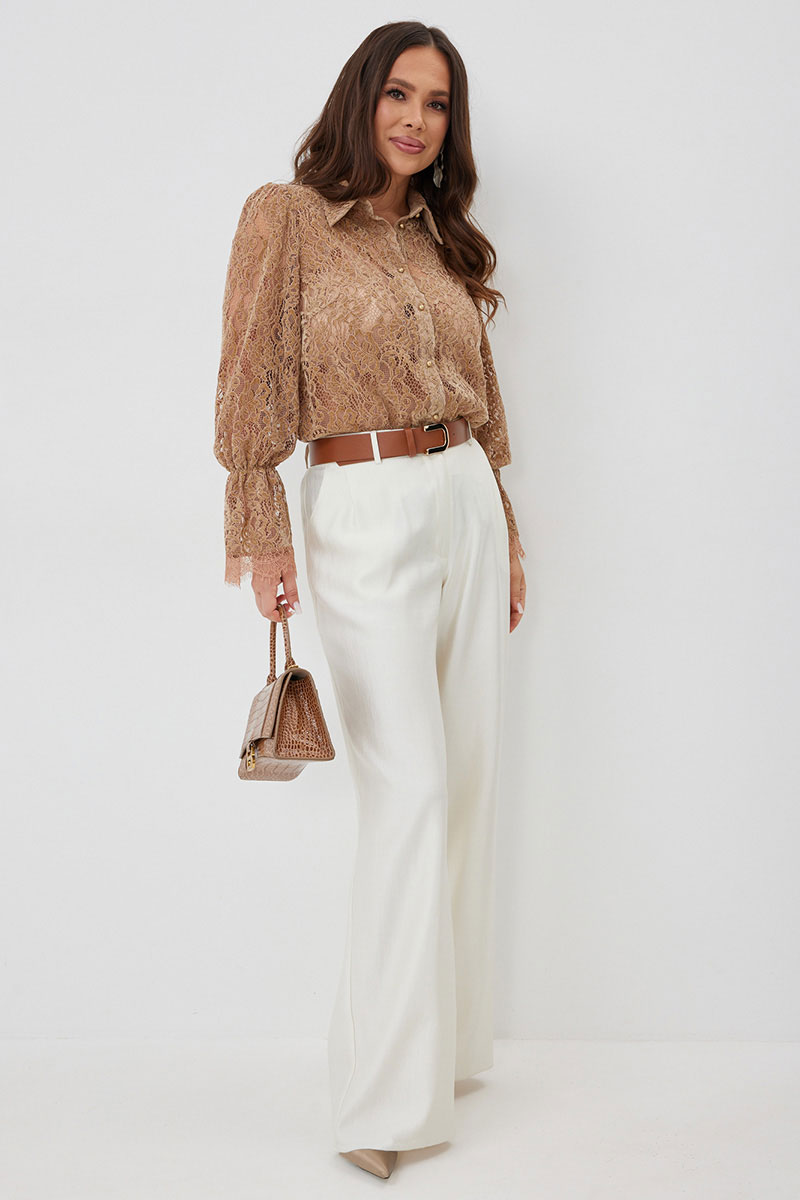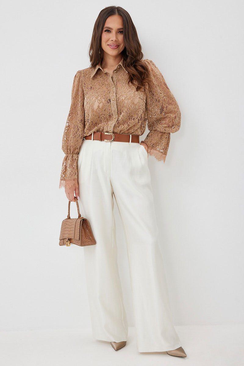 Стильный готовый образ с невероятным сочетанием кружевной блузы в нежном карамельном оттенке с шикарными брюками в красивом молочном цвете.  Блуза прямого кроя с нагрудными вытачками. Рукав втачной, по низу присборен на эластичную тесьму и дополнен притачной кружевной манжетой. Застежка центральная на пришивные пуговицы.  Воротник отложной на стойке. Блуза выполнена из красивого нежного  бархатного кружева премиум качества.  Брюки классического прямого кроя. Посадка средняя. Пояс притачной, дополнен эластичной тесьмой. Брюки дополнены удобными боковыми и задними карманами. Застежка гульфик на молнию и пуговицу. Выполнены из красивой гладкой костюмной ткани с жемчужным отливом. Красивый пояс в комплекте.