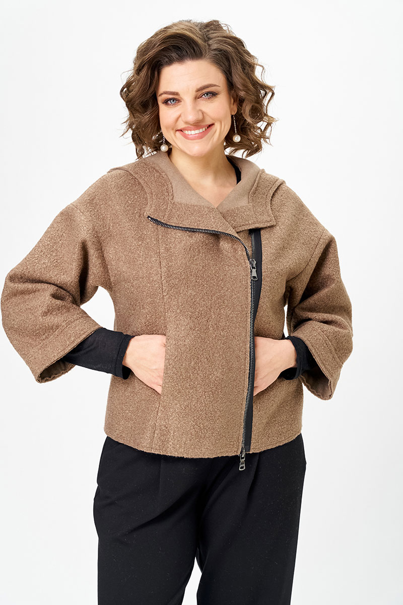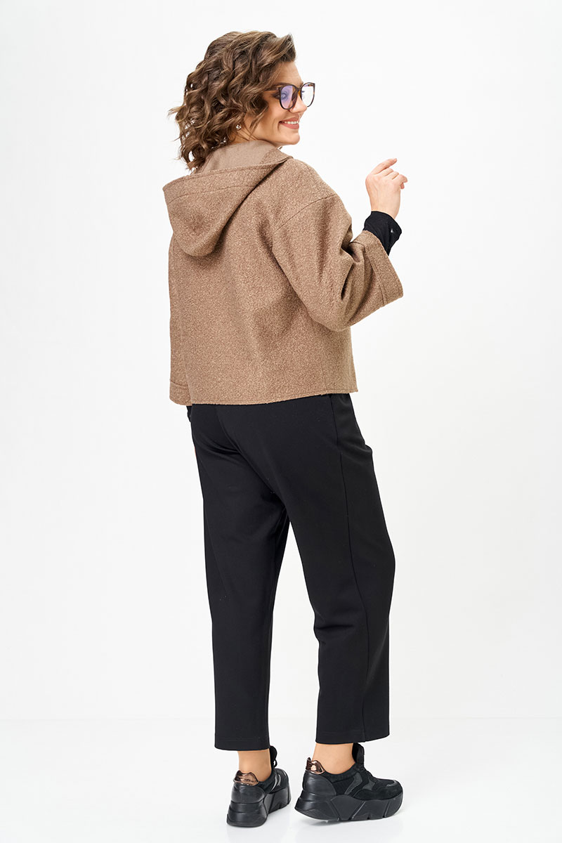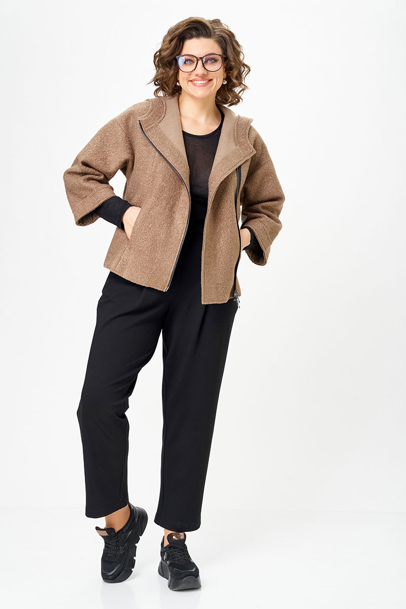 Курточка из букле - особая изюминка комплекта. Благодаря рукаву ¾ она универсальна: зимой её удобно носить в помещении как дополнительный слой, а весной, летом и осенью — как самостоятельную верхнюю одежду. Необработанные края придают образу модную лёгкую небрежность, а молния добавляет практичности и динамики.