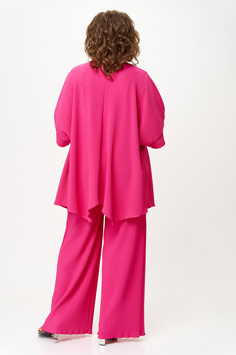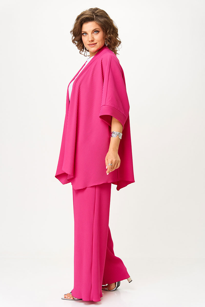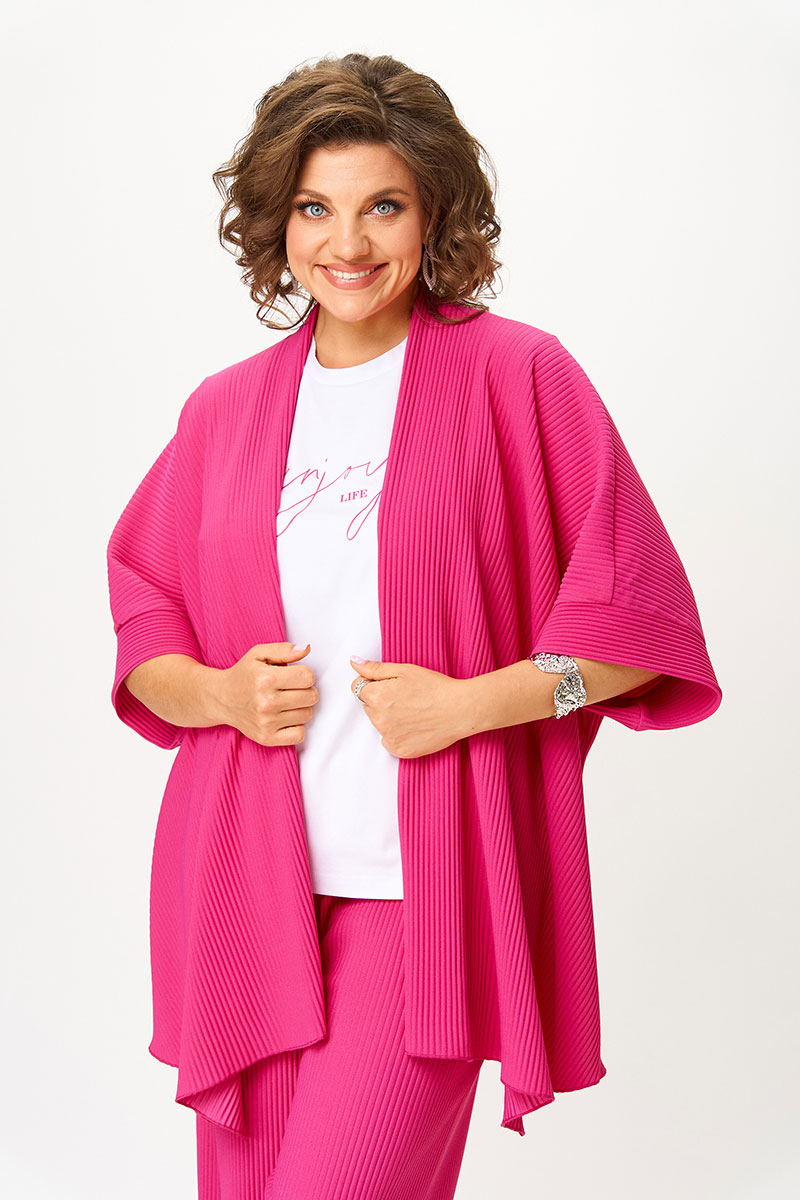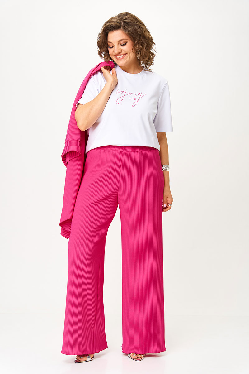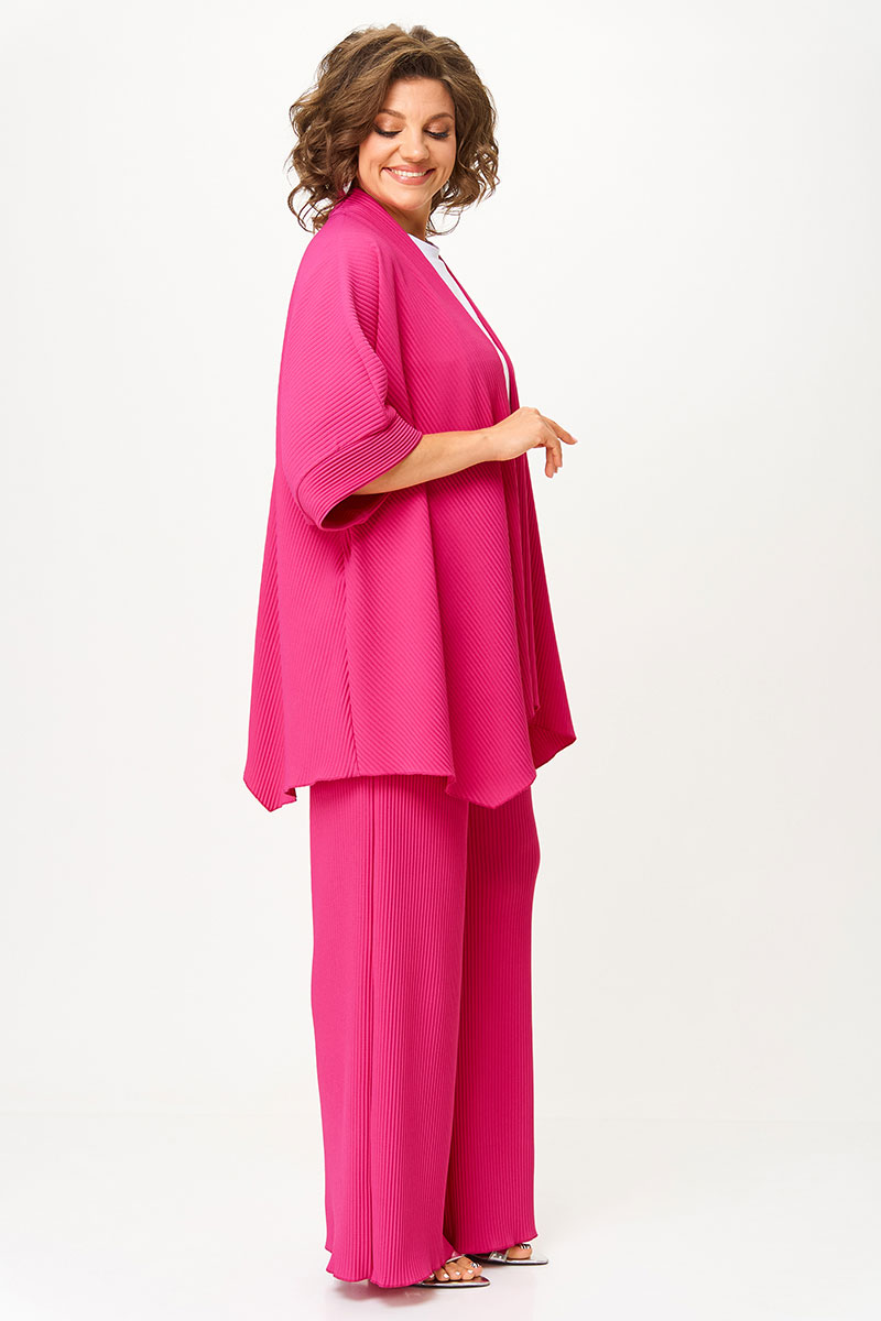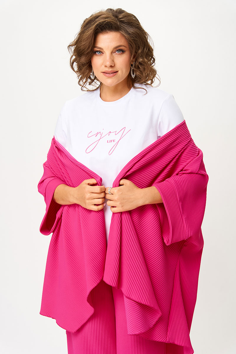 Элегантный женский костюм-тройка — идеальный выбор для повседневных и нарядных образов. В его состав входит стильный кардиган из плиссированного однотонного трикотажа с распашной застежкой, коротким цельнокроеным рукавом с притачной манжетой и фигурным низом, а также длинные брюки-палаццо на эластичном поясе с резинкой — комфортные и модные. В комплект входит классическая белая футболка с коротким рукавом и принтом, которая отлично дополняет образ. Этот наряд подчеркнет вашу индивидуальность и создаст гармоничный стиль для любого случая.