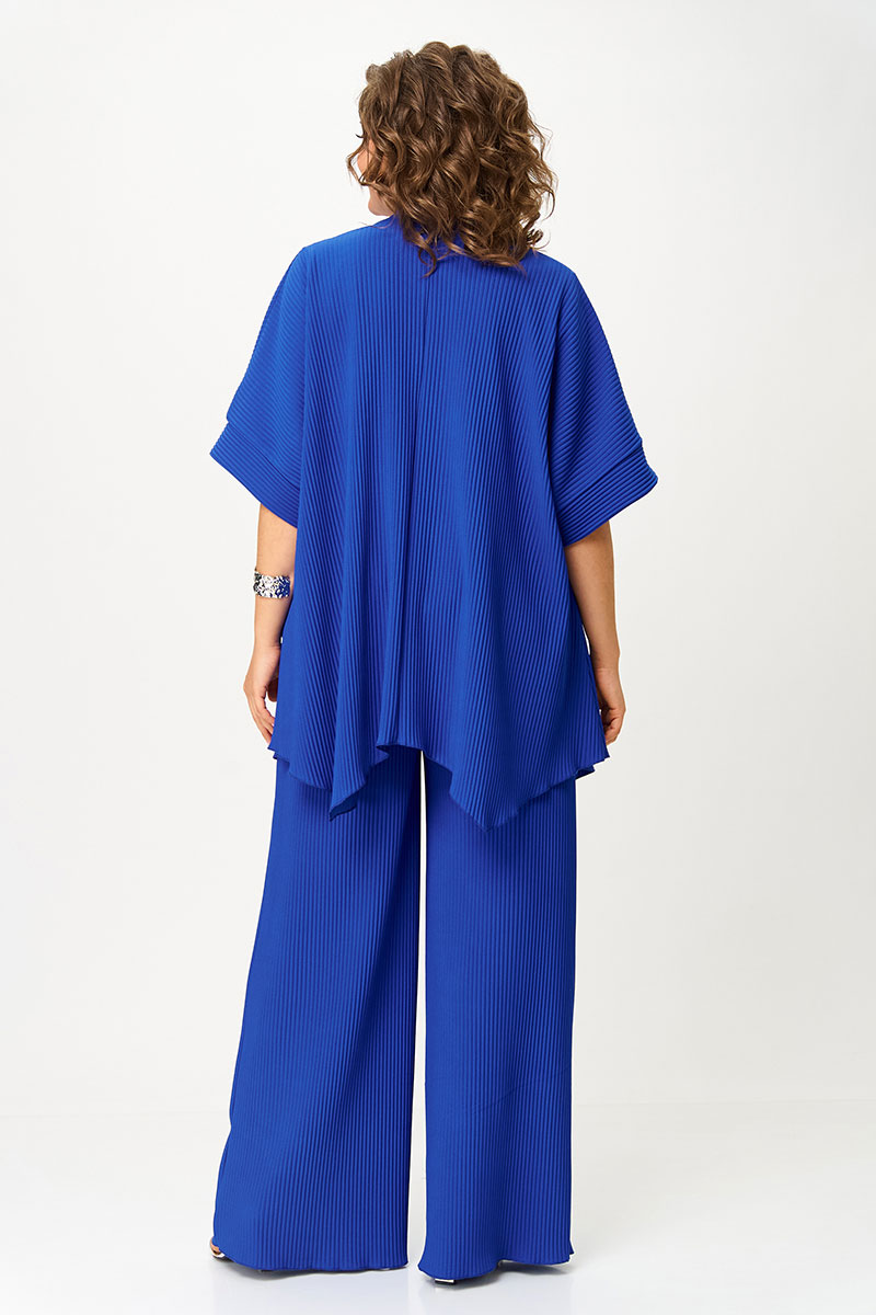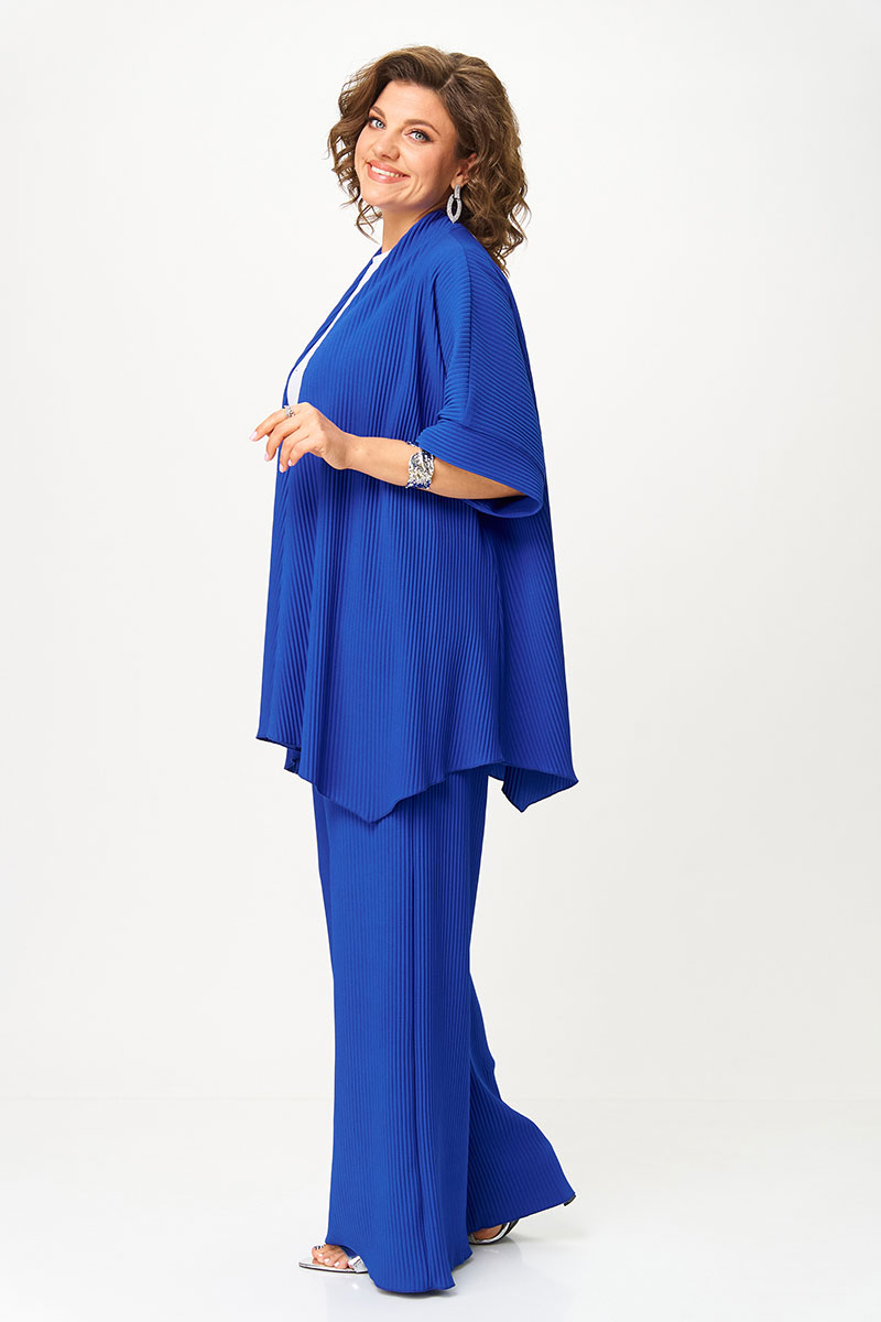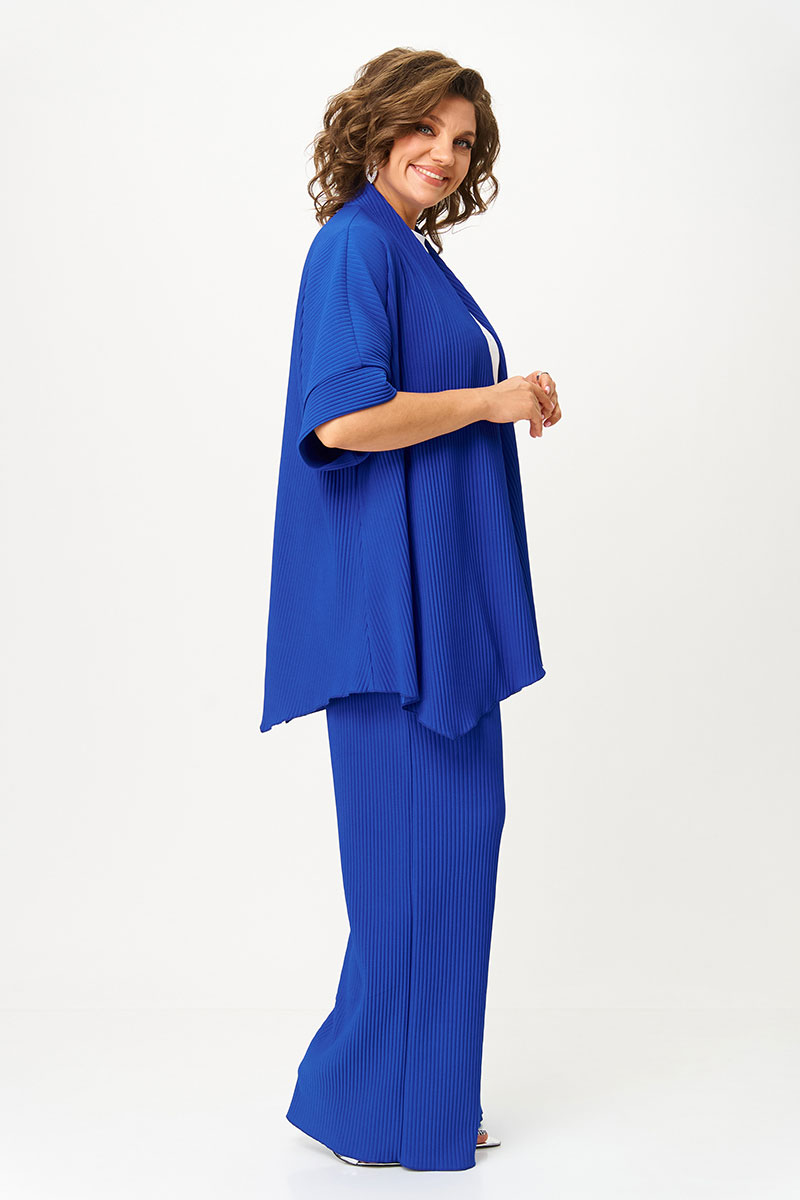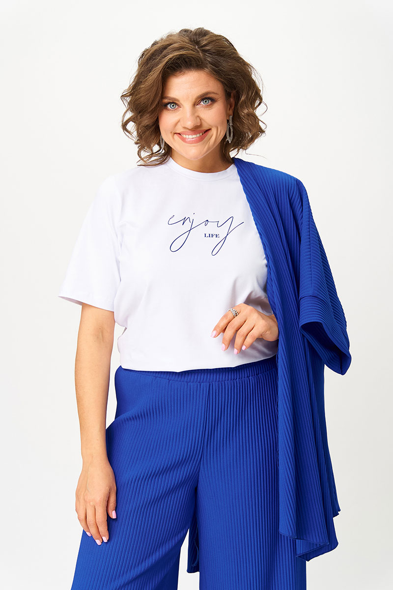 Элегантный женский костюм-тройка — идеальный выбор для повседневных и нарядных образов. В его состав входит стильный кардиган из плиссированного однотонного трикотажа с распашной застежкой, коротким цельнокроеным рукавом с притачной манжетой и фигурным низом, а также длинные брюки-палаццо на эластичном поясе с резинкой — комфортные и модные. В комплект входит классическая белая футболка с коротким рукавом и принтом, которая отлично дополняет образ. Этот наряд подчеркнет вашу индивидуальность и создаст гармоничный стиль для любого случая.