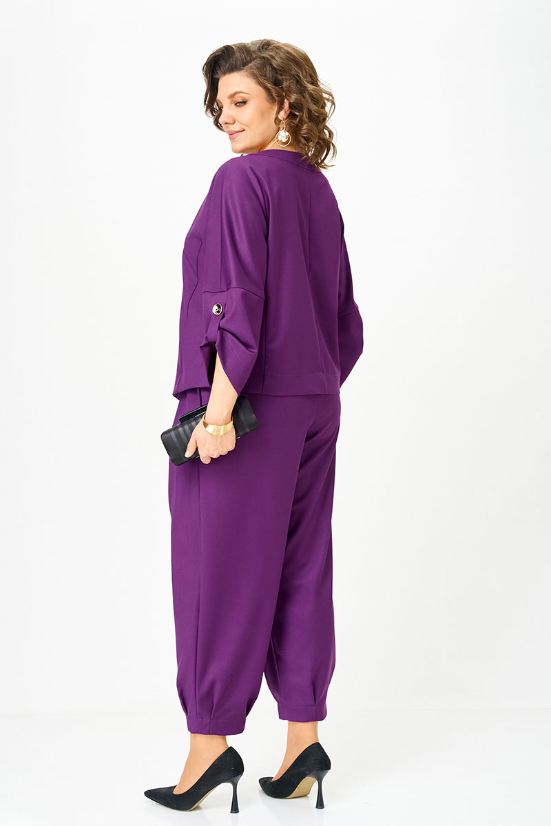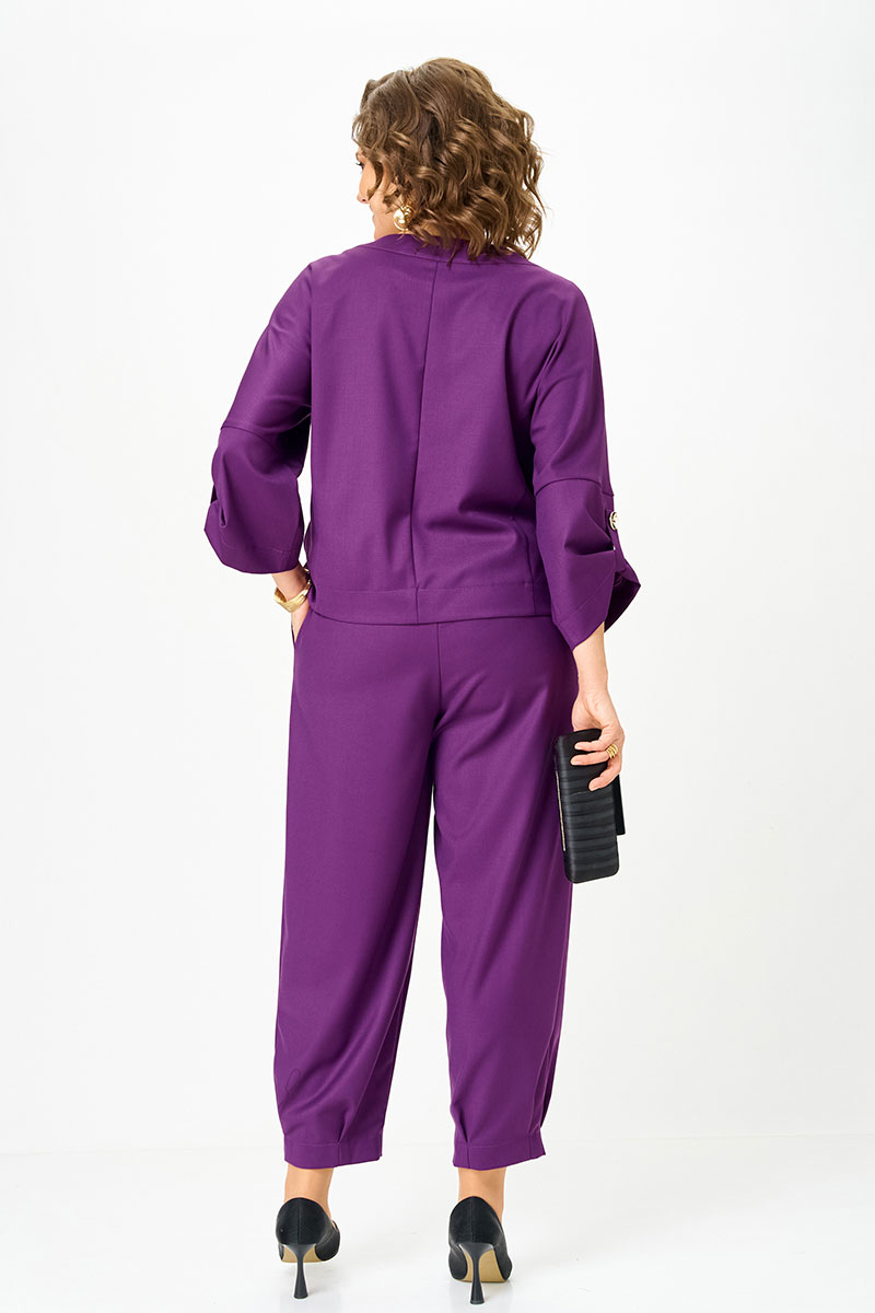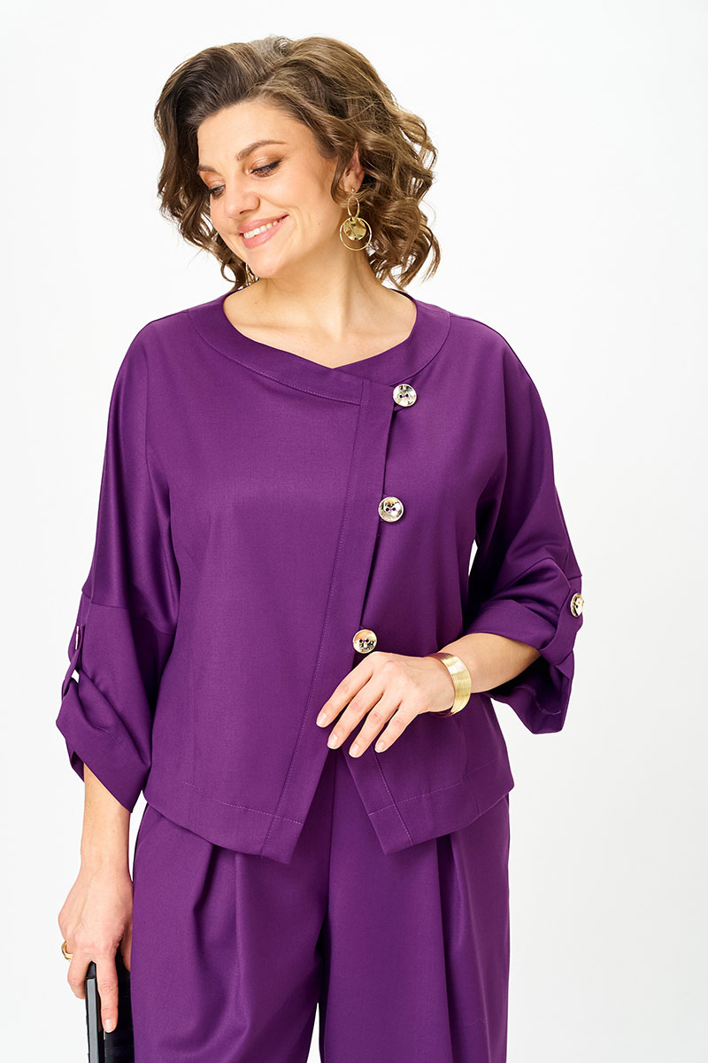 Этот костюм создан для женщины, которую невозможно не заметить. Глубокий пурпур — насыщенный, благородный, притягивающий взгляд — делает образ выразительным и статусным. Асимметричная застёжка топа добавляет характер и позволяет играть с настроением: носить застёгнутым как самостоятельный акцент или распахнутым — как лёгкий жакет поверх блузы или топа.