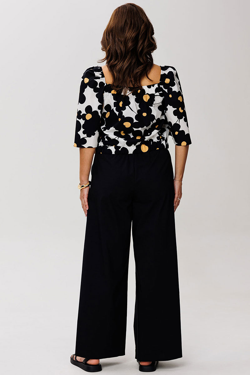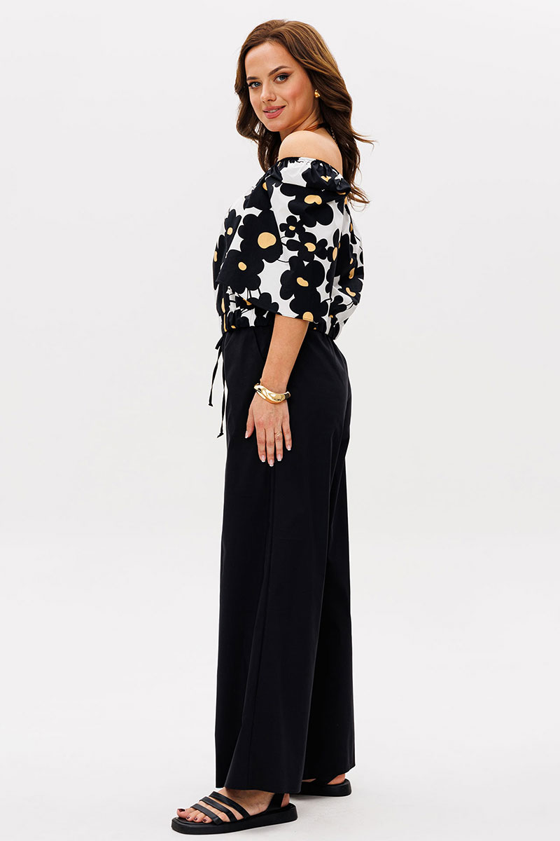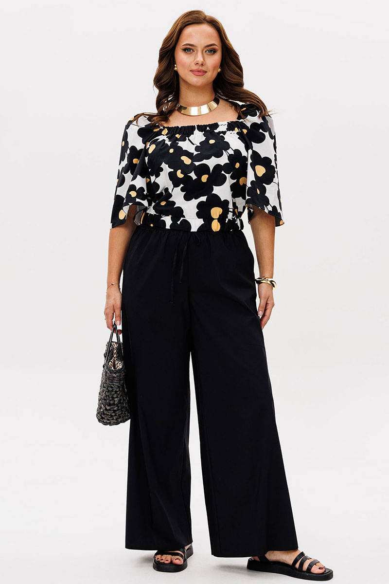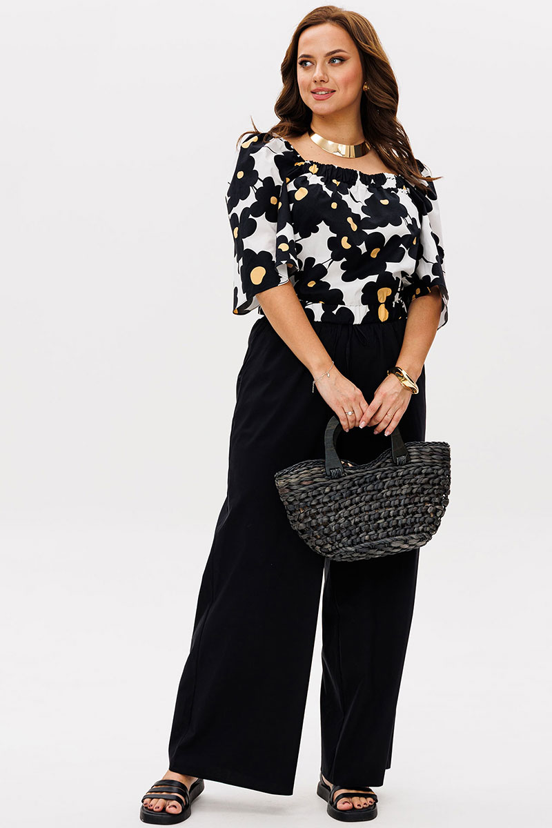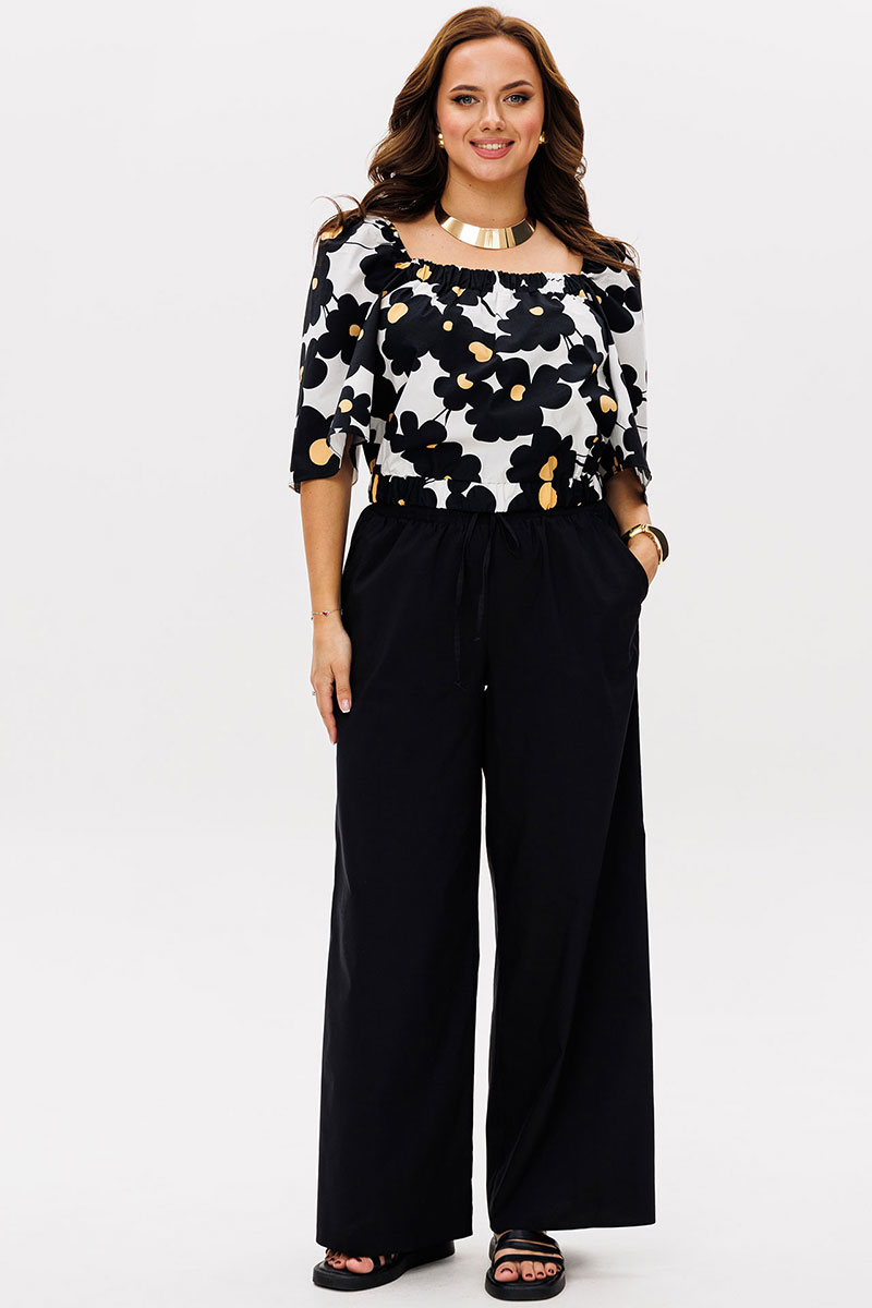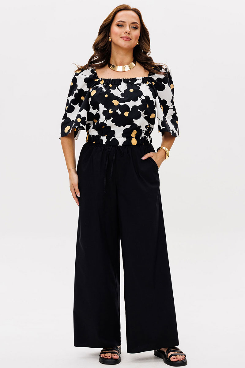 Брюки на резинке, свободные, прямые, с карманами в боковых швах.