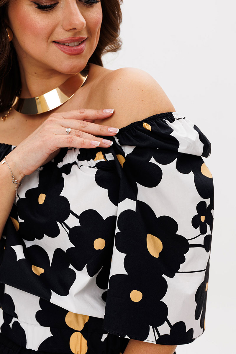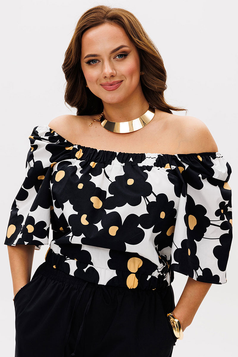 Рукав у блузы - реглан, со сбокой по окату. Рукав расширенный до линии локтя. По переду и спинке блузы - притачная планка с резинкой. Низ блузы с притачным поясом и резинкой.