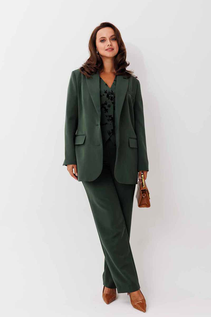 Элегантный женский костюм, состоящий из жакета и прямых брюк, выполнен из костюмной однотонной ткани.