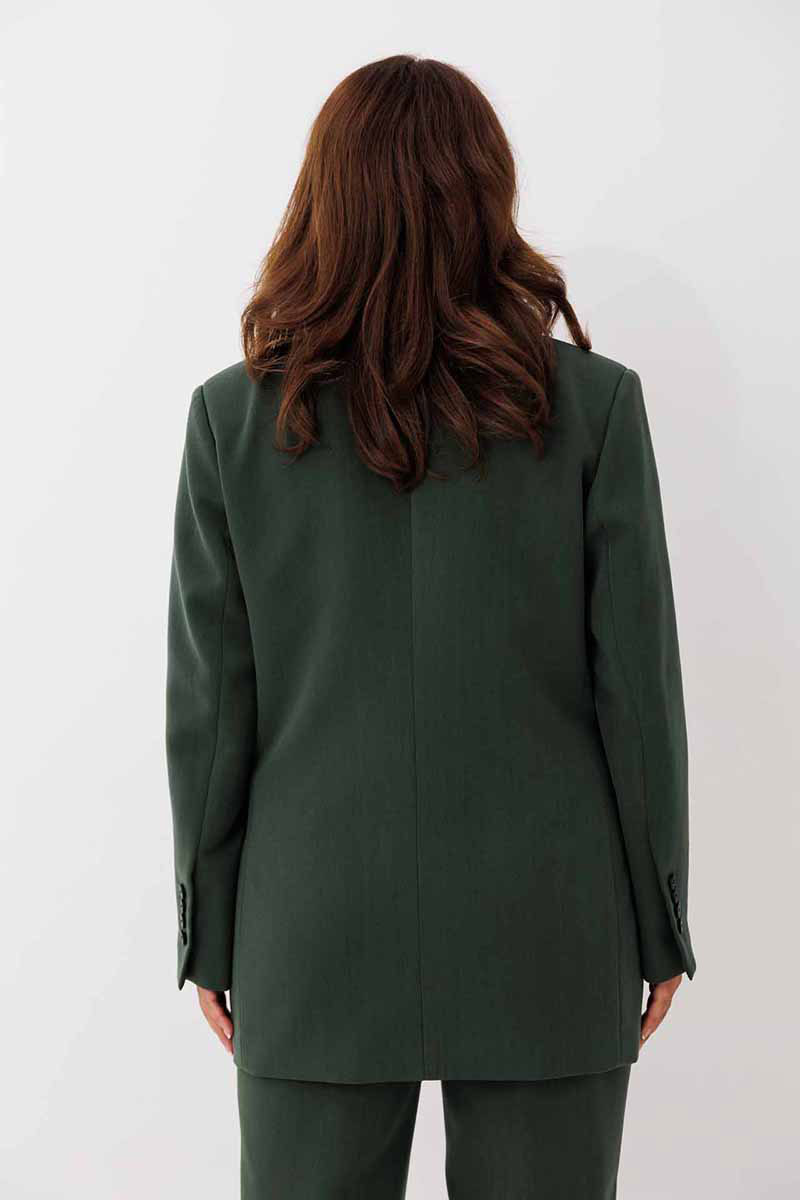 Жакет однобортный, на петлях и пуговицах, с английским воротником и клапанами по бокам. Рукав втачной, длина — полная. Посадка свободная, что обеспечивает комфорт и стильный силуэт.
