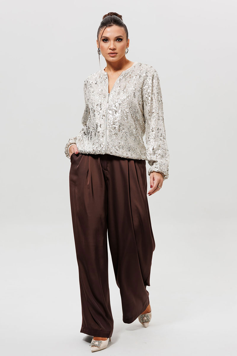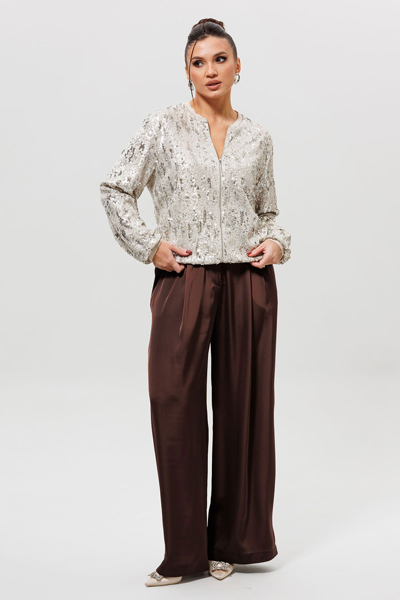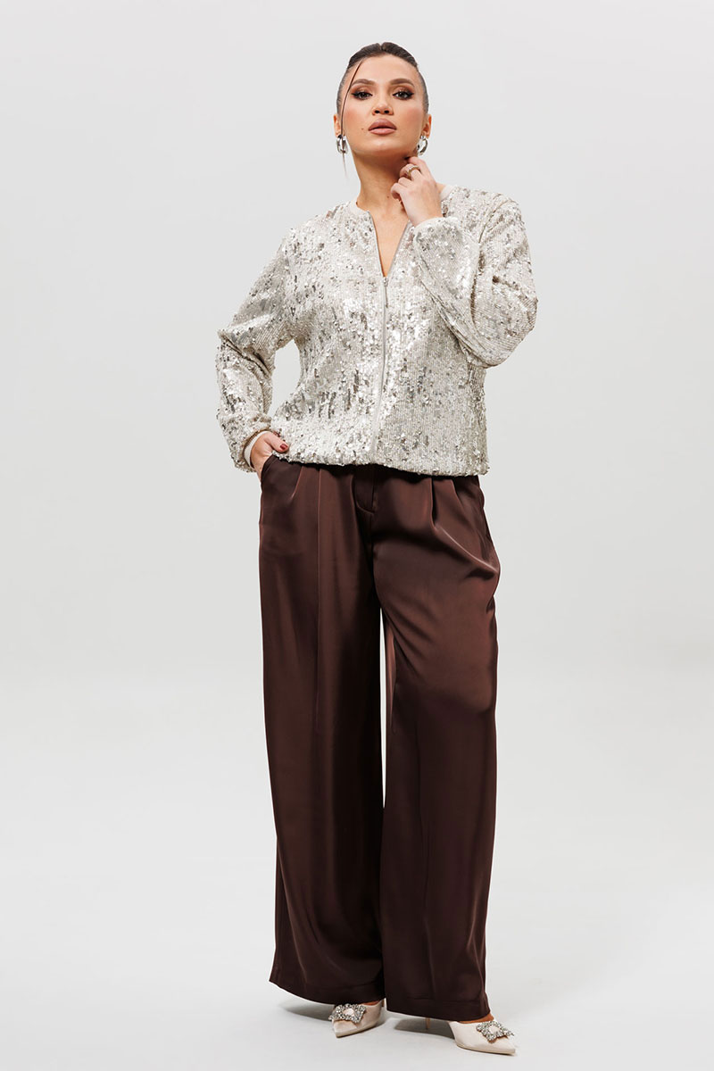 Костюм состоит из жакета и брюк. Жакет(бомбер) полностью покрыт мерцающими пайетками, которые создают неповторимый блестящий эффект при каждом движении. Бомбер с пайетками отлично сочетается с коктейльными платьями, базовыми топами и джинсами, позволяя создавать как дерзкие, так и элегантные луки. Эта пайеточная куртка станет главным акцентом вашего наряда для вечеринки, посещения клуба или романтического свидания. Брюки выполнены из атласной ткани, расширены к низу. На передних половинках брюк обработаны 2 складки и боковые карманы. На задних – талиевые вытачки. Застёжка на молнию и 2 потайных крючка. Эти атласные брюки (Арт. 1282) — Must Have для создания безупречного вечернего или праздничного образа. Модель представлена в двух богатых оттенках: насыщенном красном и глубоком шоколадном. Брюки выполнены из блестящей атласной ткани, которая мягко струится, подчеркивая изящество каждого движения. Атласные брюки с завышенной талией обеспечивают комфортную посадку и визуально вытягивают силуэт.