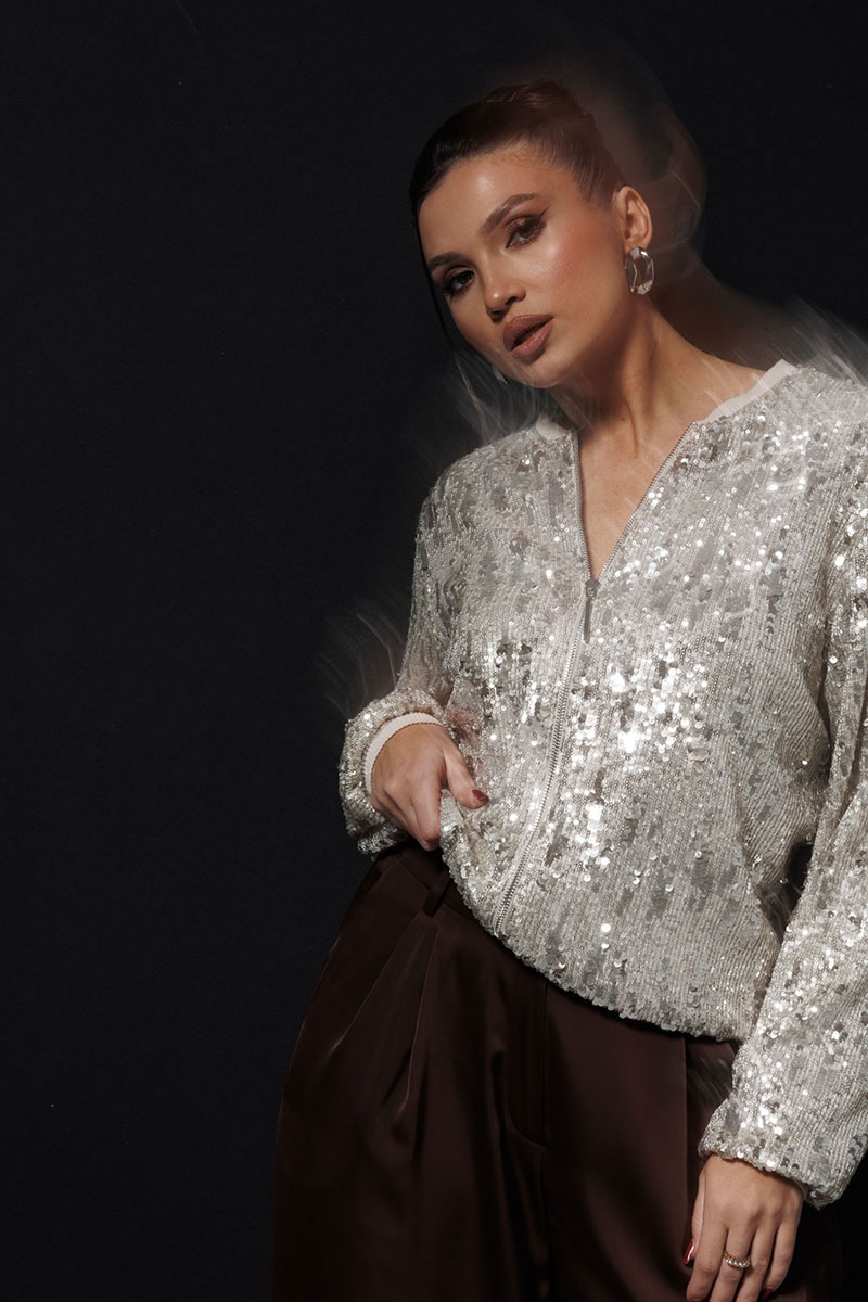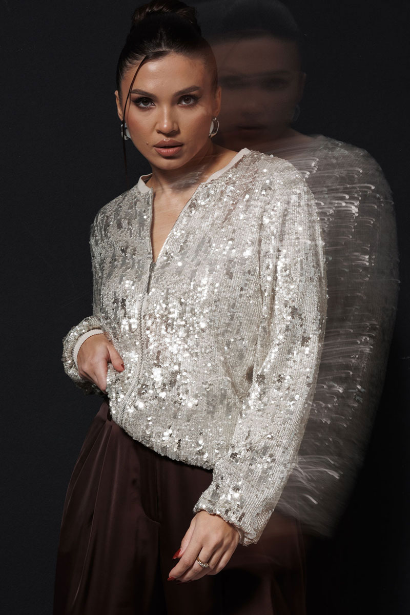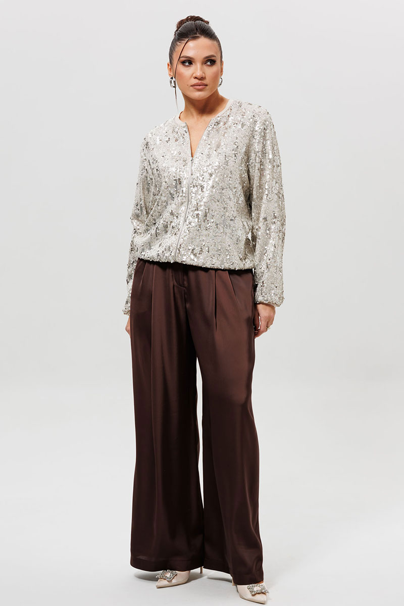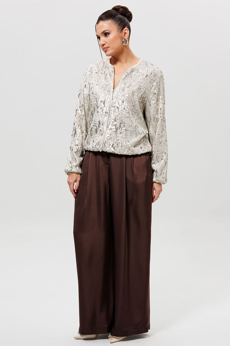 Костюм состоит из жакета и брюк. Жакет(бомбер) полностью покрыт мерцающими пайетками, которые создают неповторимый блестящий эффект при каждом движении. Бомбер с пайетками отлично сочетается с коктейльными платьями, базовыми топами и джинсами, позволяя создавать как дерзкие, так и элегантные луки. Эта пайеточная куртка станет главным акцентом вашего наряда для вечеринки, посещения клуба или романтического свидания. Брюки выполнены из атласной ткани, расширены к низу. На передних половинках брюк обработаны 2 складки и боковые карманы. На задних – талиевые вытачки. Застёжка на молнию и 2 потайных крючка. Эти атласные брюки (Арт. 1282) — Must Have для создания безупречного вечернего или праздничного образа. Модель представлена в двух богатых оттенках: насыщенном красном и глубоком шоколадном. Брюки выполнены из блестящей атласной ткани, которая мягко струится, подчеркивая изящество каждого движения. Атласные брюки с завышенной талией обеспечивают комфортную посадку и визуально вытягивают силуэт.