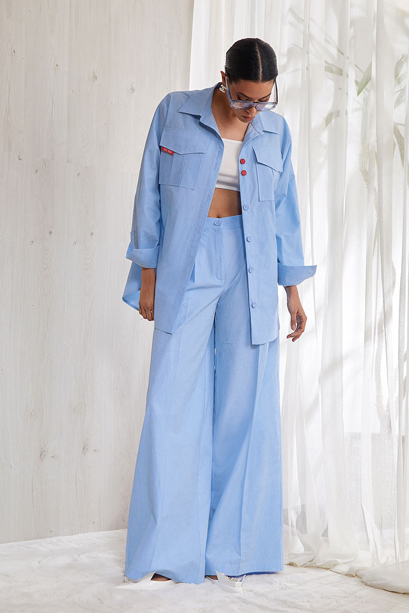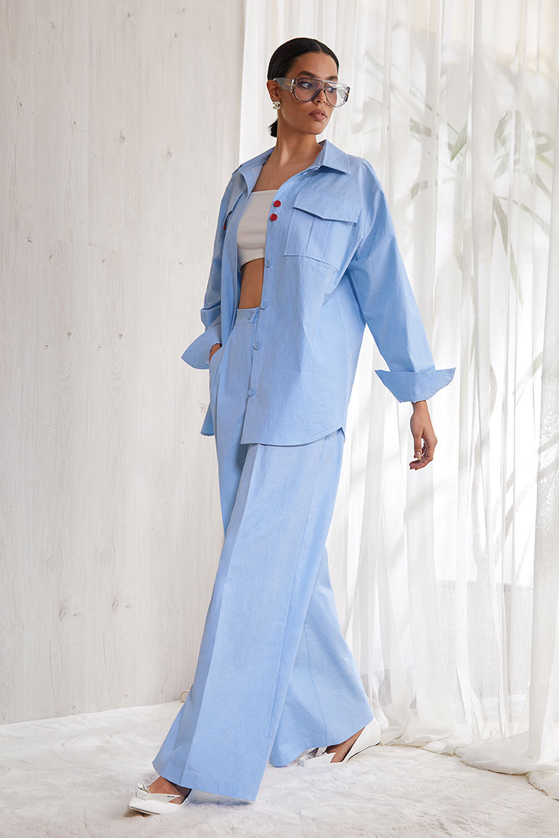 Костюм, состоящий из стильной удлиненной рубашки и брюк.