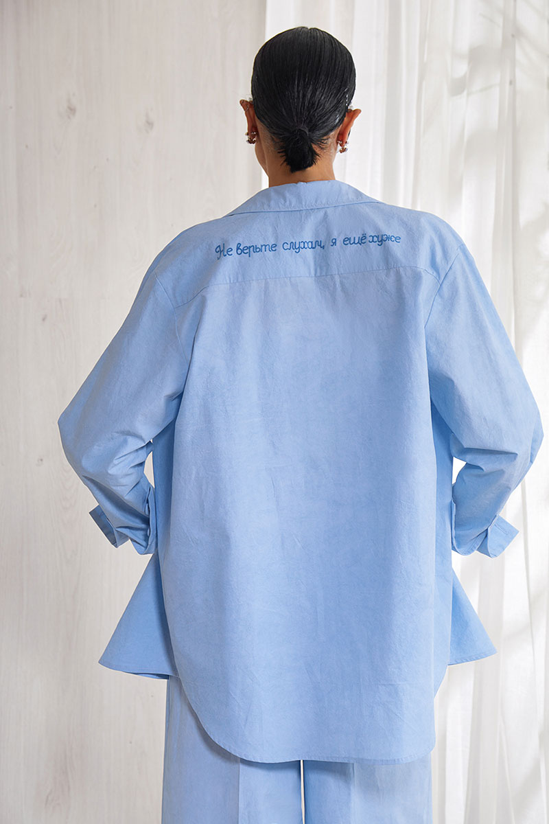 Рубашка прямого силуэта длиной до середины бедра. Центральная бортовая застежка доверху на петли и брендированные пуговицы. Накладные карманы-портфели и фигурные клапаны на полочках изделия. Фигурная кокетка по спинке изделия. Спущенная линия плеча. Объемный рубашечный рукав. Низ рукава на притачной манжете. Воротник рубашечный. Ассиметричный низ изделия. На кокетке авторский принт, выполнен флоком.