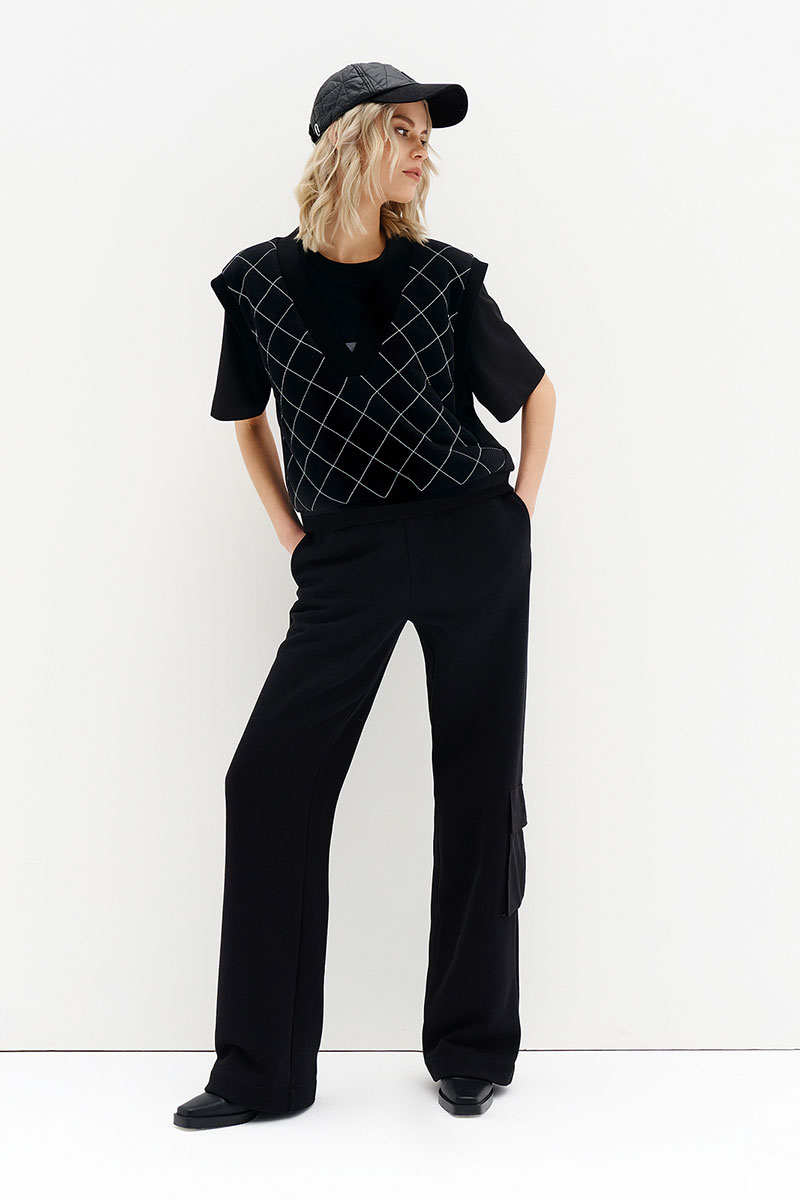 Трикотажный комплект из стильного жилета с оригинальной контрастной стежкой и актуальных базовых брюк на резинке.
