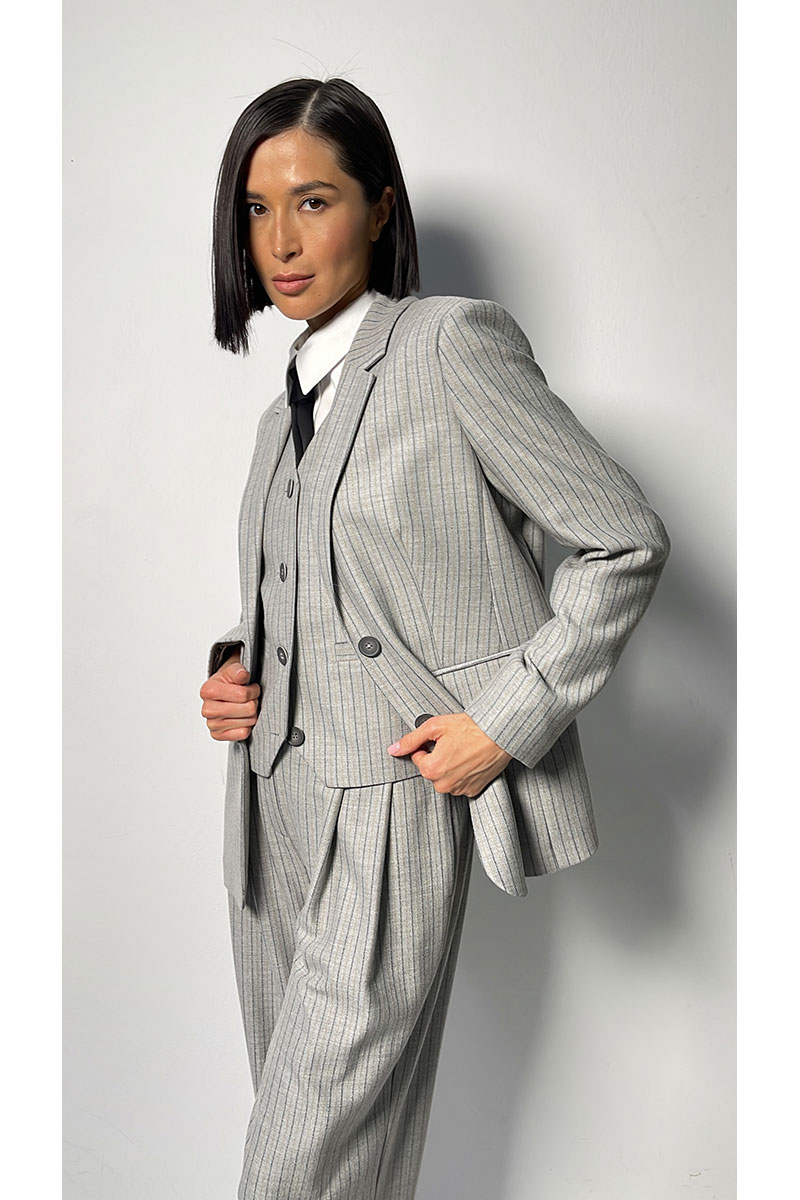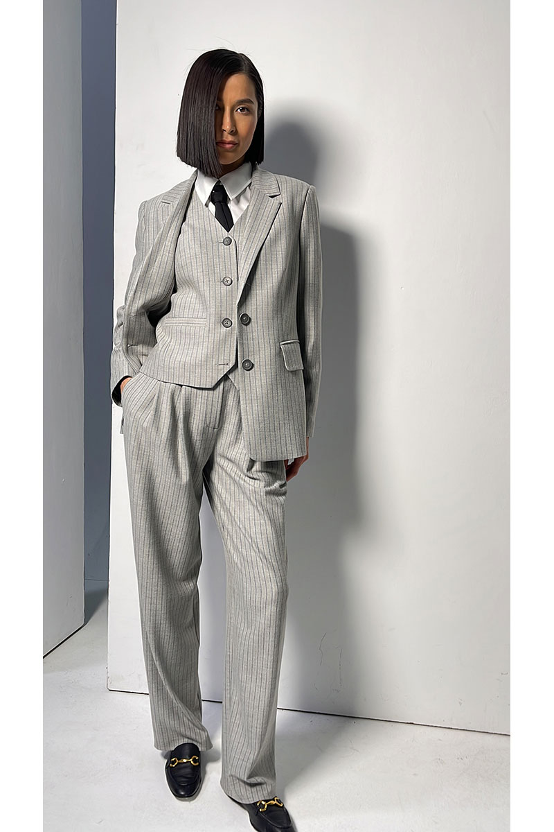Комплект классического кроя включает в себя жакет, жилет и брюки.