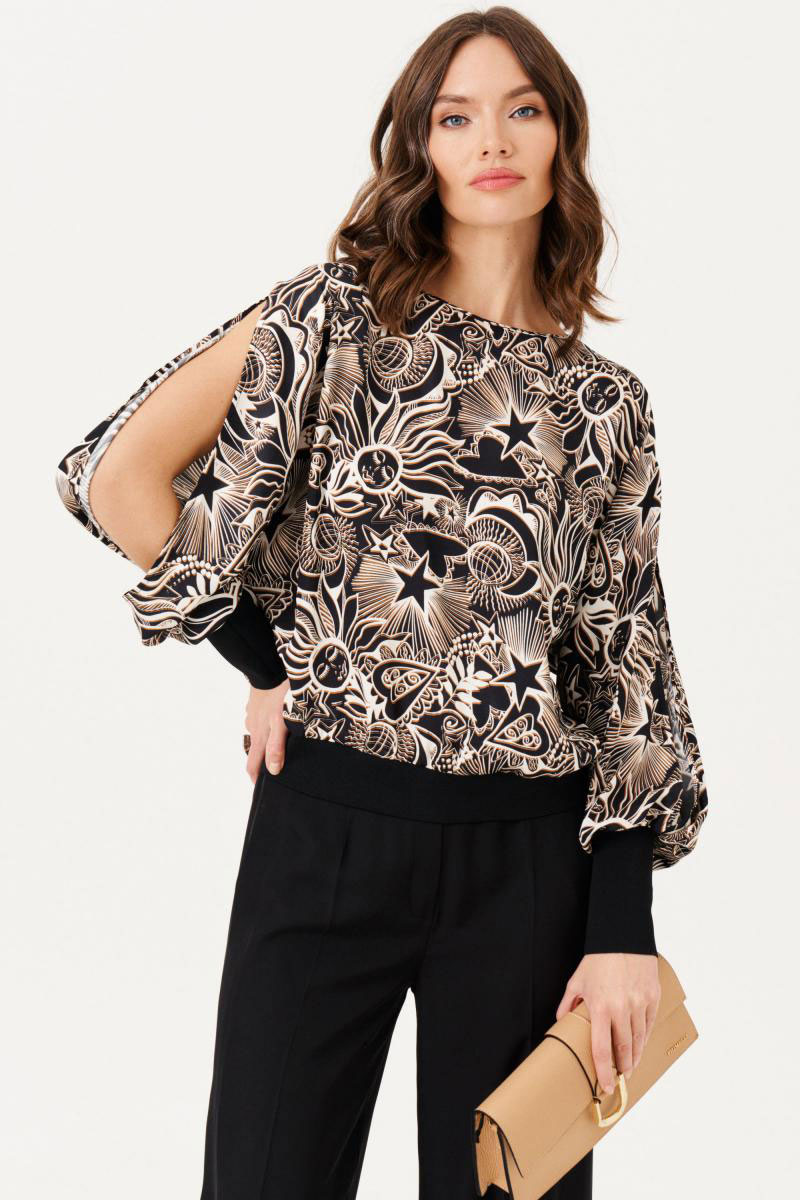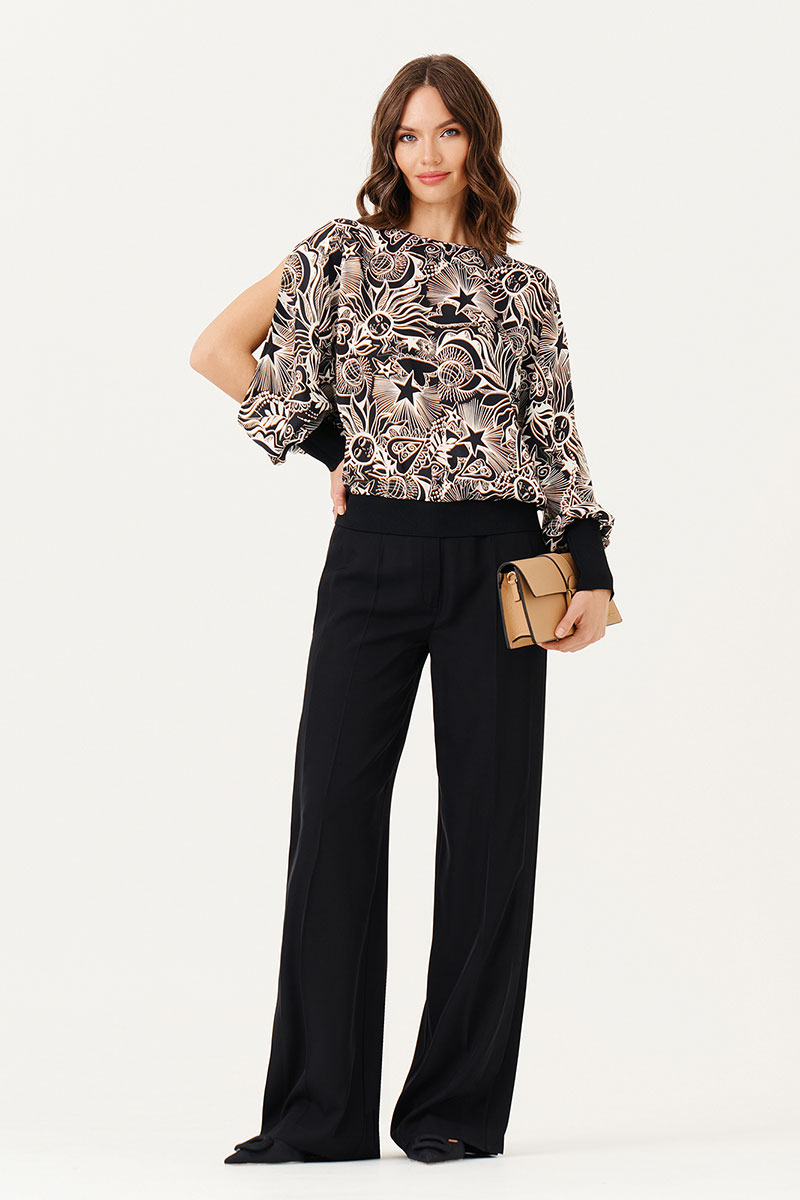 Блузка из полотна премиального качества с дизайнерским принтом в комплекте с базовыми брюками прямого кроя.