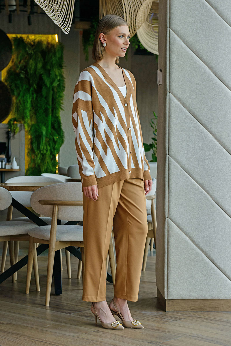 Состав: джемпер: хлопок 55%, акрил 45%, ПЭ 5%; брюки: вискоза 61%, ПЭ 39%