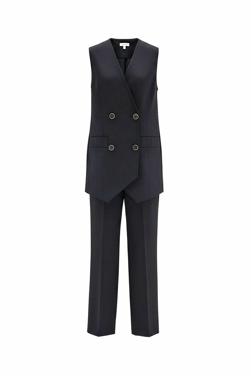 В 44 размере: полуобхват груди 46 см, полуобхват бёдер 50 см, в брюках полуобхват по поясу 36 см, полуобхват бёдер 50 см.