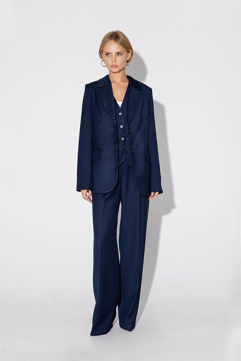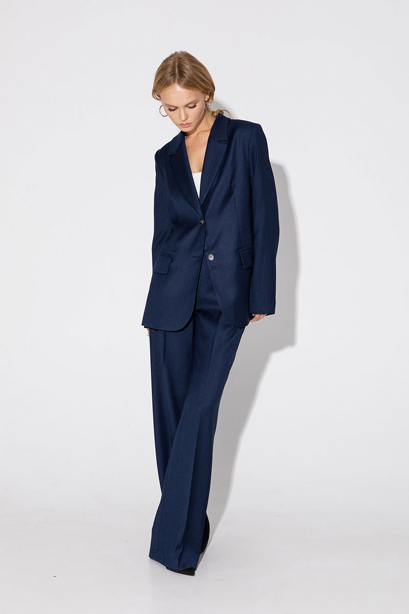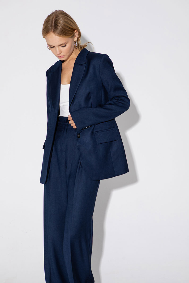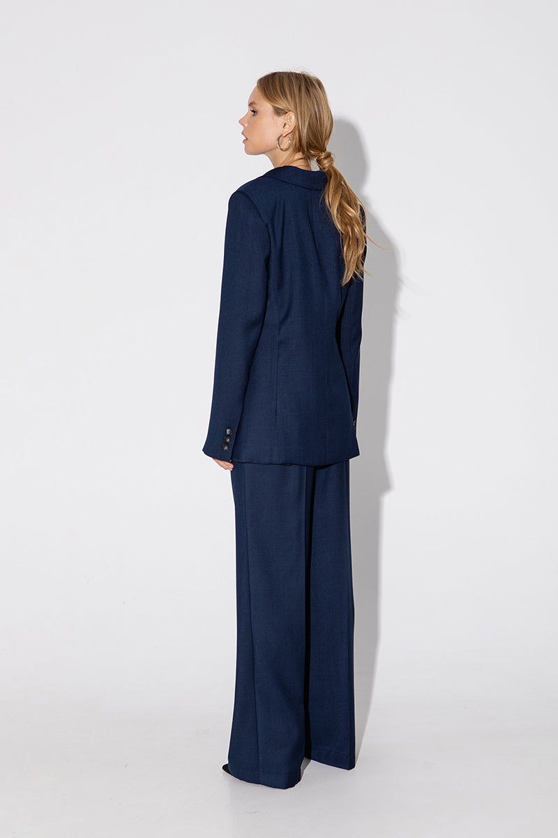 Текстильный костюм-двойка из свободного жакета со шлицами и широких прямых брюк.