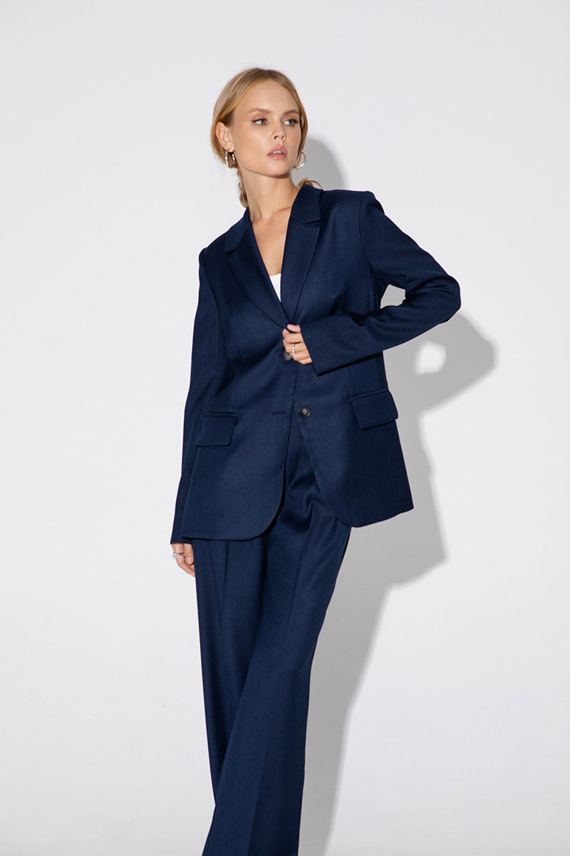 Детали: жакет полуприлегающего силуэта, талиевые вытачки, пиджачный воротник, застежка на две петли и пуговицы, функциональные карманы, рукава и спинка со шлицами, жакет на подкладке.