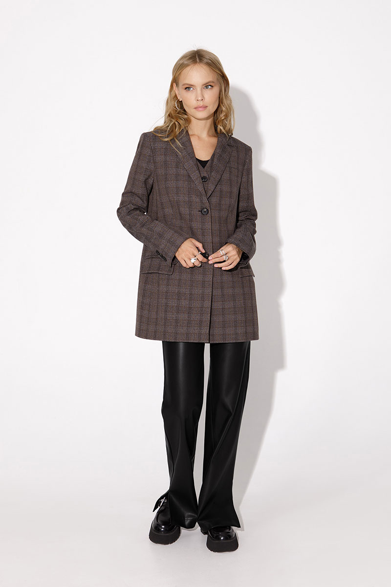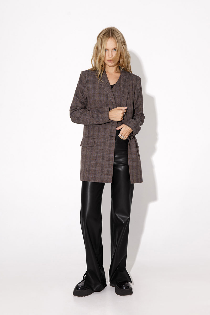 Комплект-двойка из трапециевидного жакета свободного покроя в клетку и прямых брюк из экокожи.