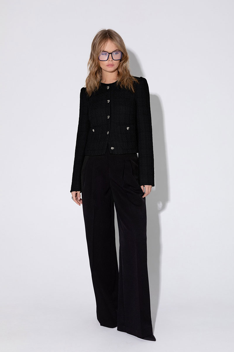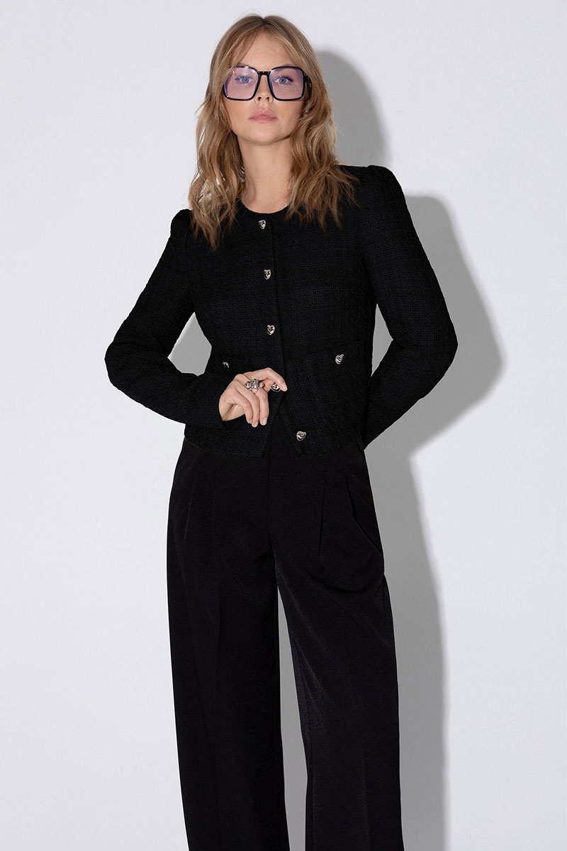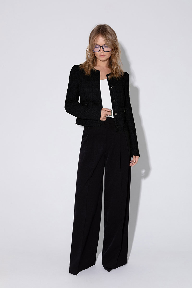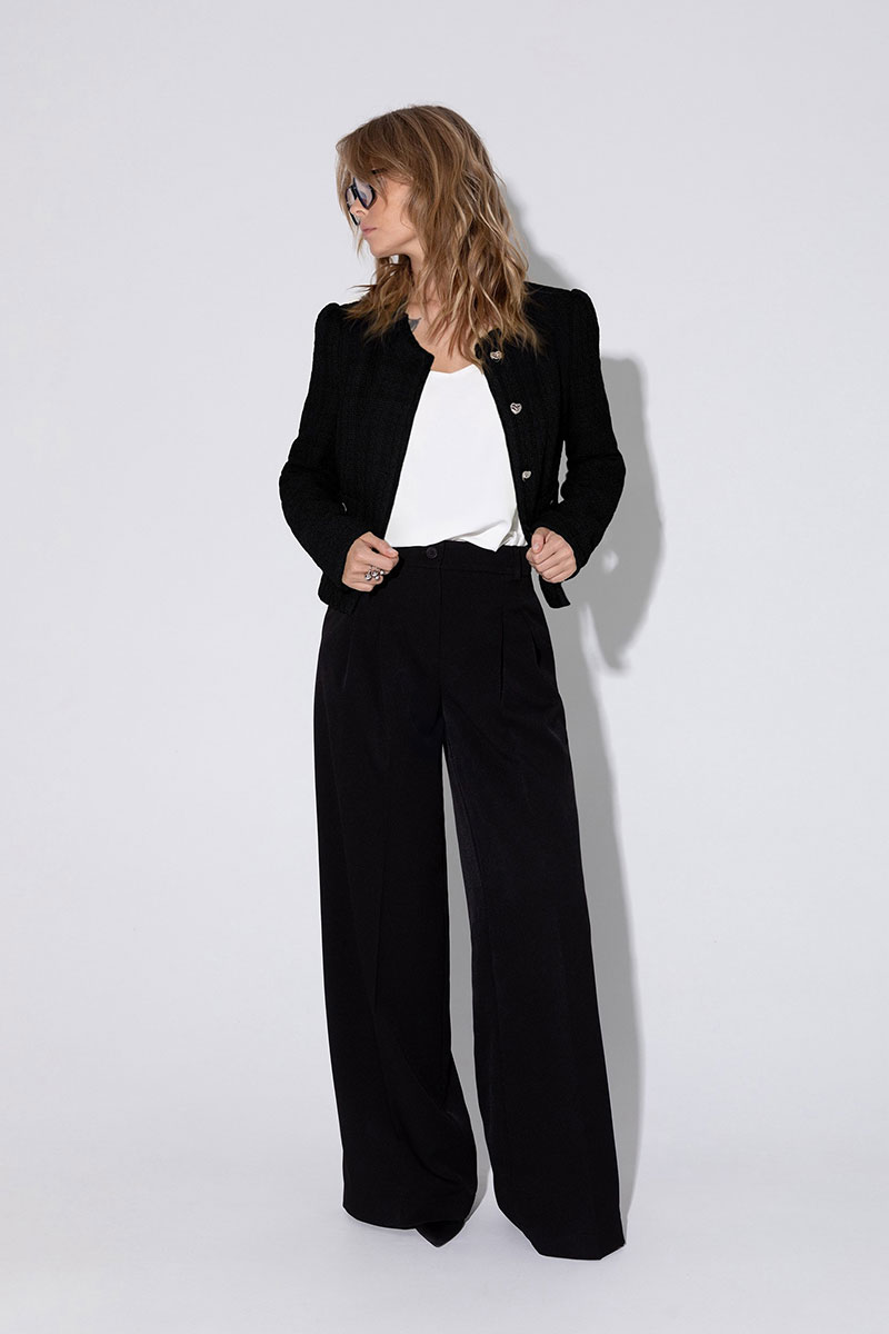Костюм-двойка из укороченного жакета из фактурной ткани в стиле «шанель» и брюк-палаццо.