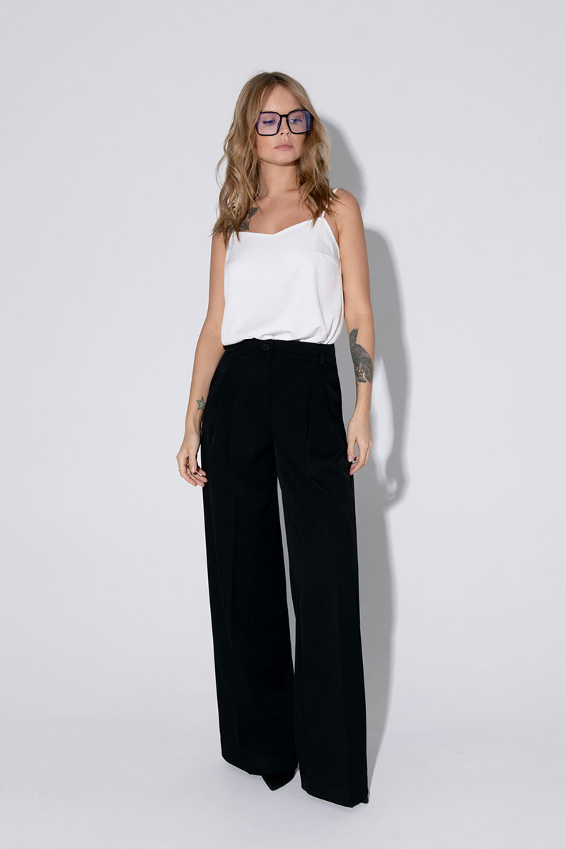 Широкие брюки-палаццо с небольшими складками у пояса и заутюженными стрелками, притачной пояс со шлевками, застежка на молнию и пуговицу, боковые карманы. Задние части брюк с вытачками и имитацией карманов.
