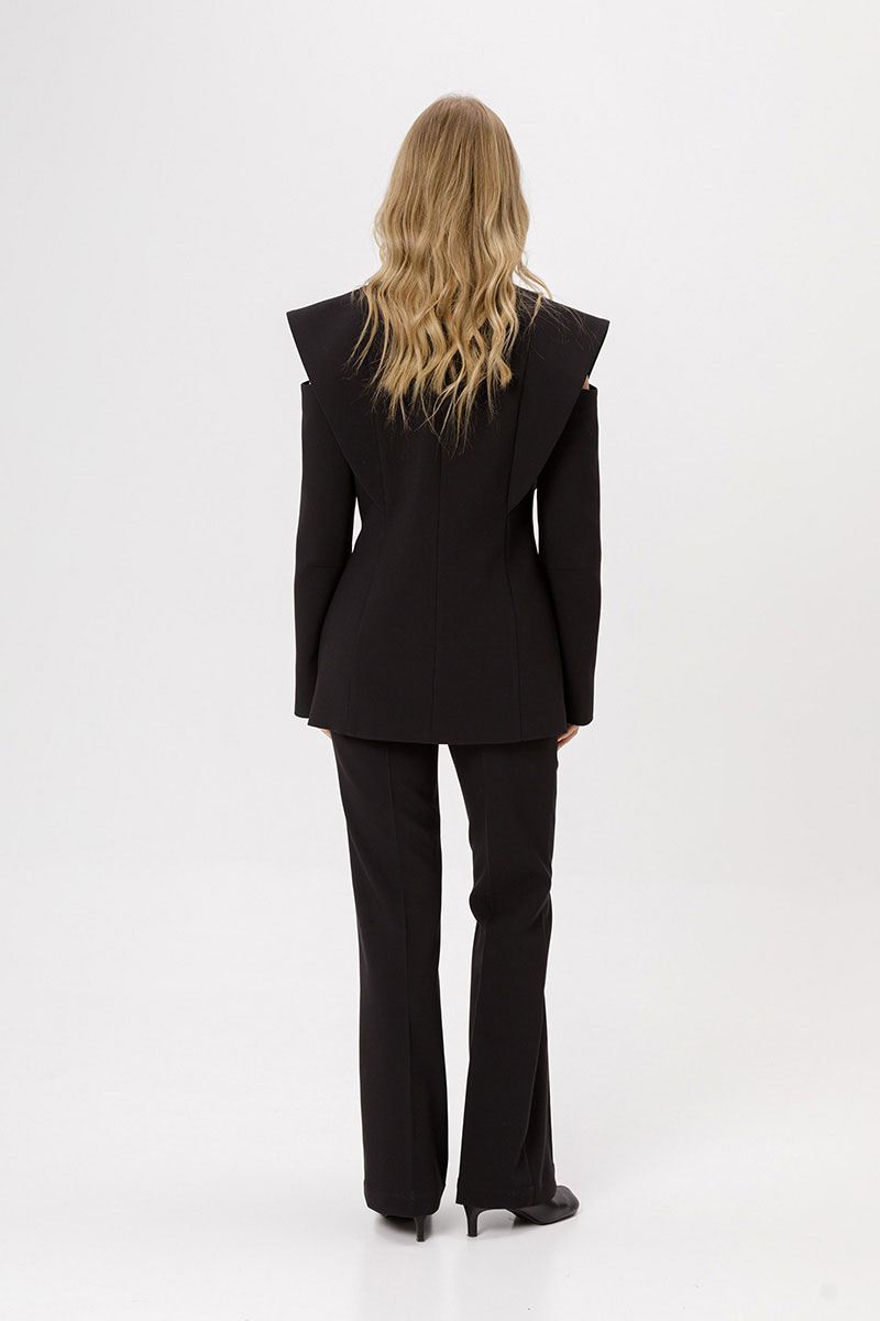 Костюм-двойка из приталенного двубортного жакета и облегающих брюк-клёш со стрелками.
