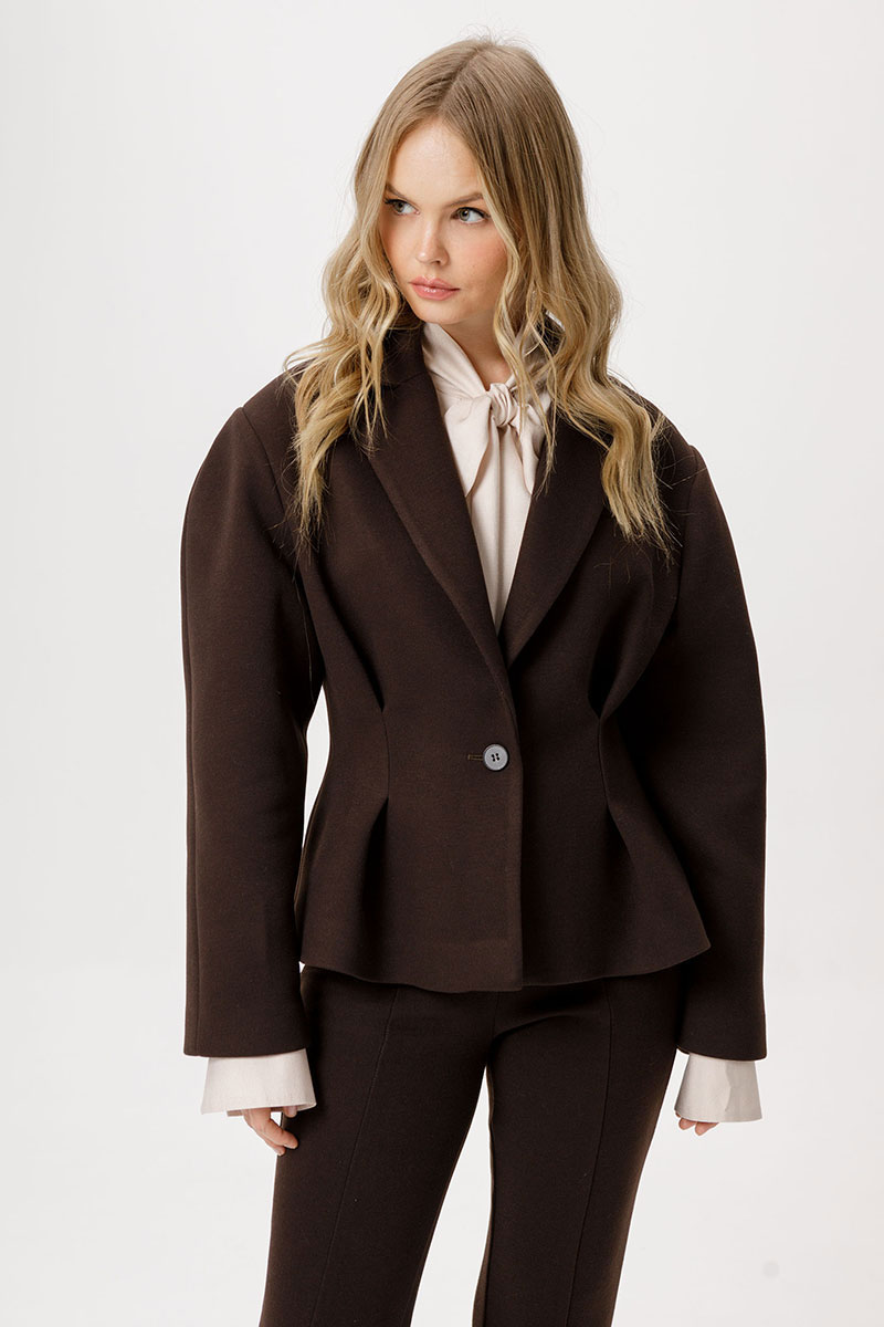 Детали: полуприлегающий силуэт, пиджачный воротник, застежка на петлю и пуговицу, жакет на подкладке. Брюки с высокой посадкой, эластичный пояс с резинкой, без карманов и застежки.