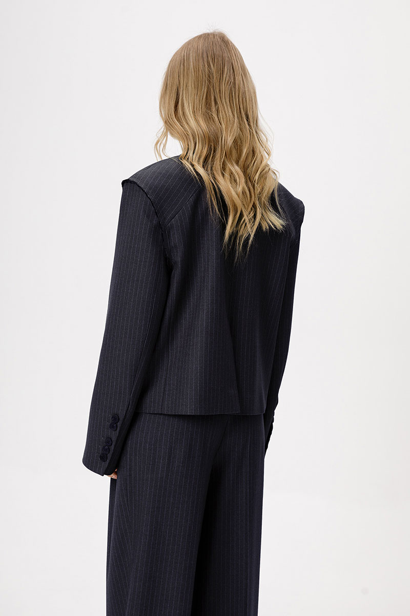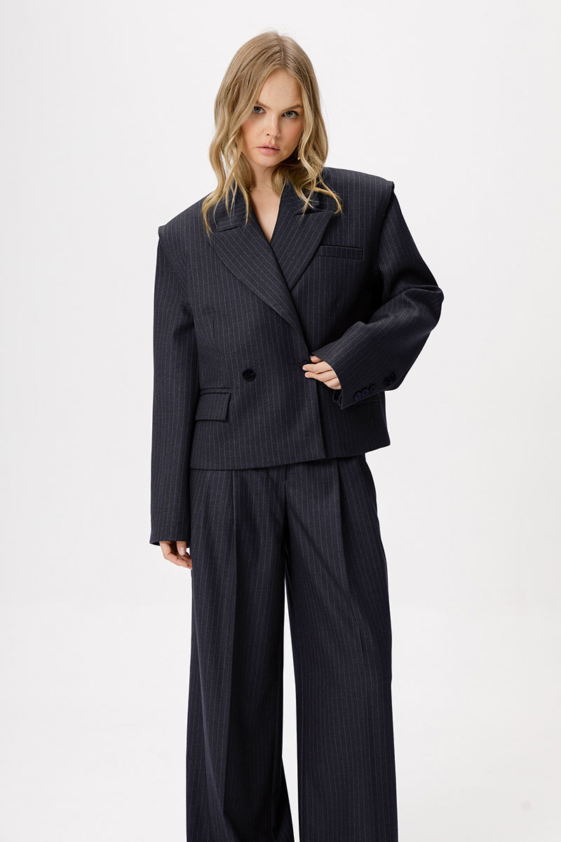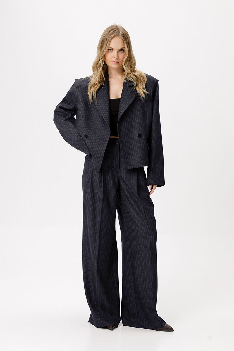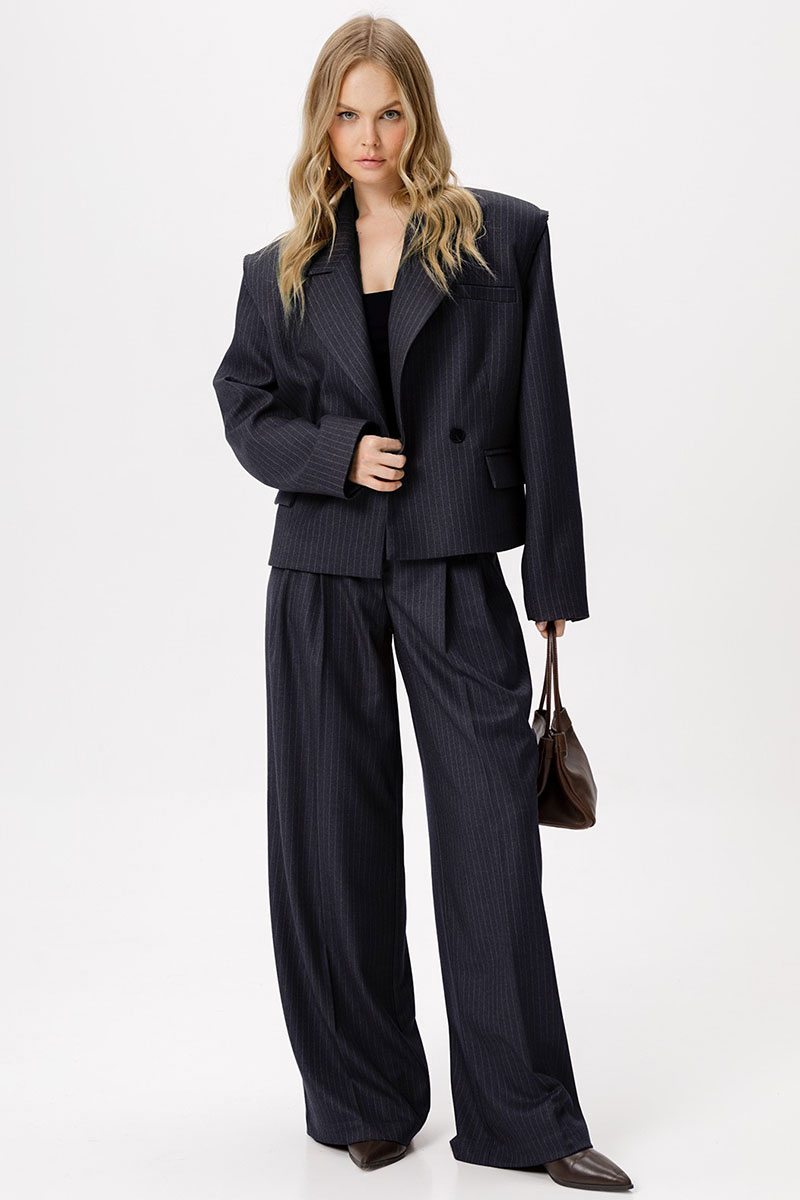 Костюм-двойка из укороченного оверсайз жакета с необработанным краем пройм и широких брюк-палаццо из текстильной ткани в полоску.