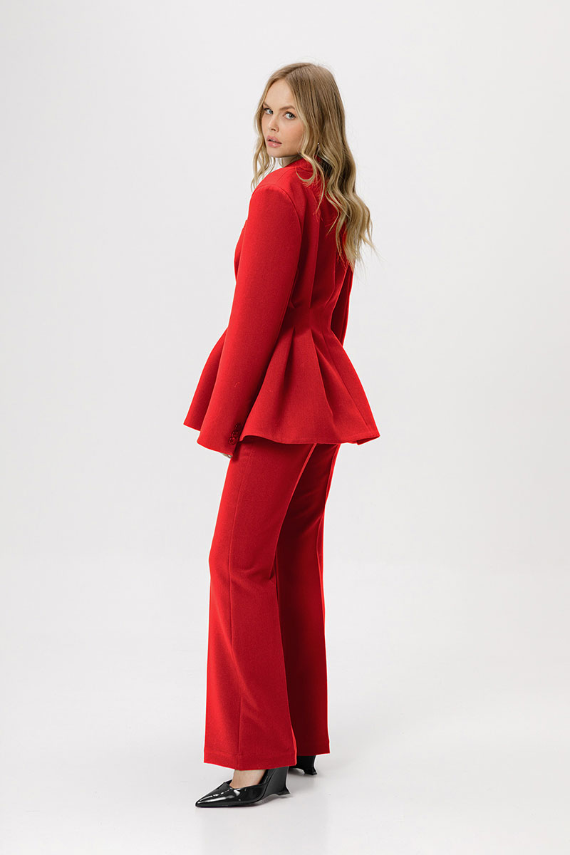 Костюм-двойка из приталенного жакета со складками и брюк-клеш со стрелками.