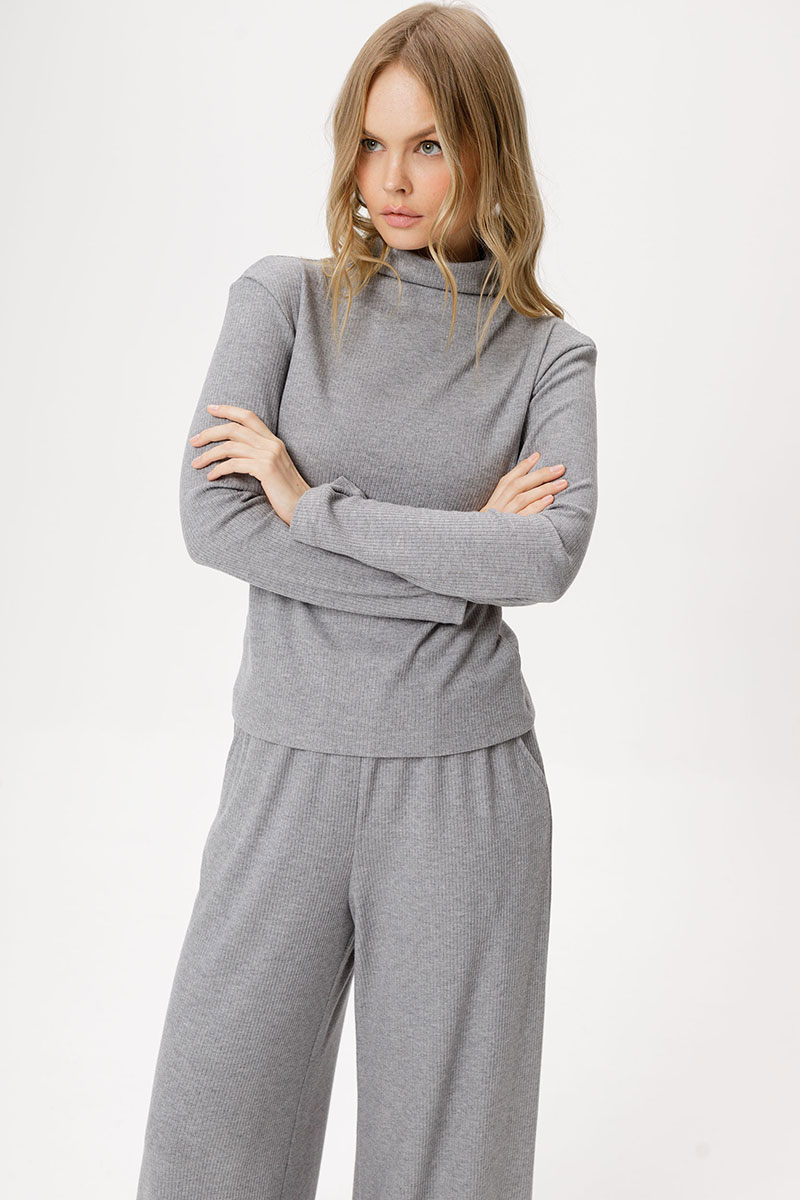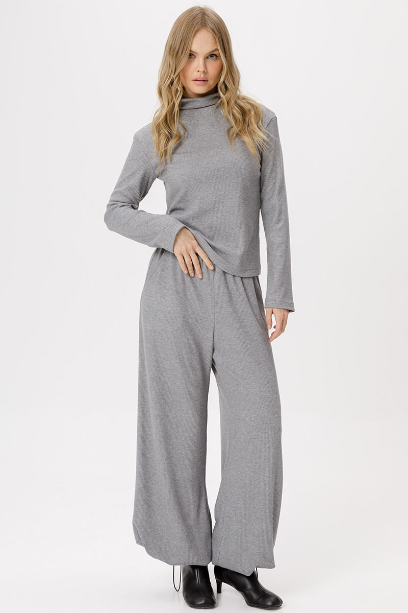 Трикотажный костюм-двойка из джемпера с цельнокроеной стойкой и широких брюк.