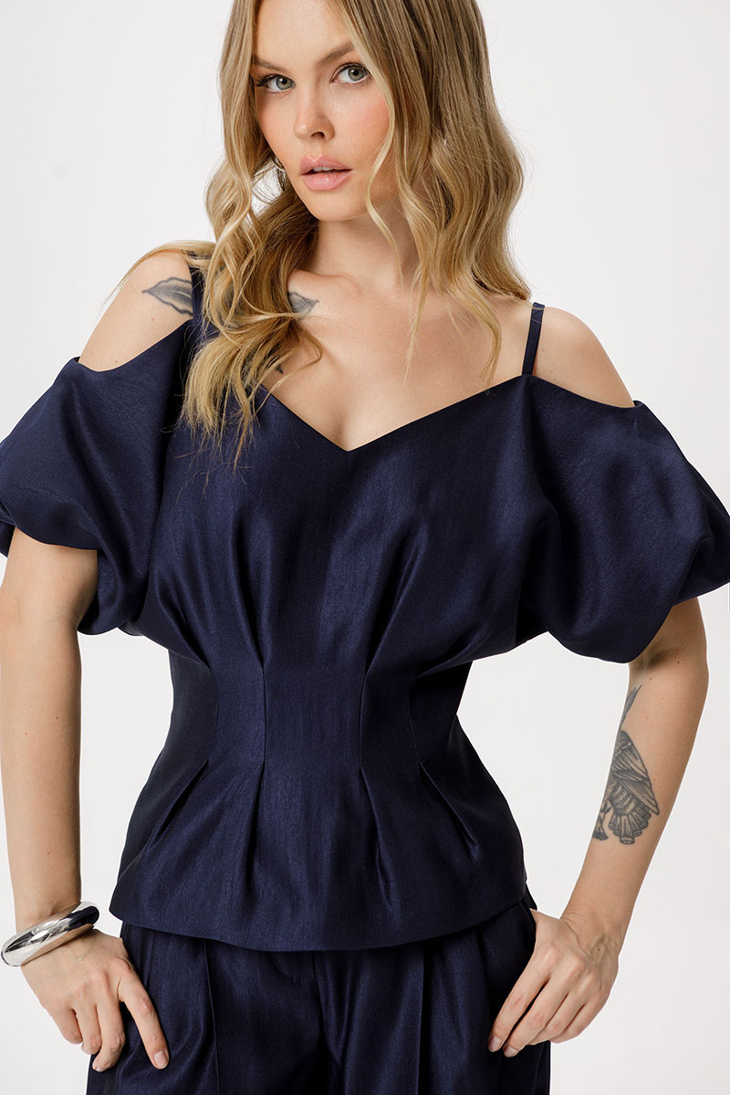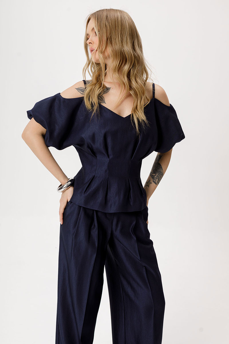 Детали: блуза приталенного силуэта с застроченными складками по линии талии, V-образный вырез переда и спинки, рукава короткие цельнокроеные с вырезом по плечу, застежка на потайную молнию по спинке, на подкладке. Брюки с притачным поясом со шлевками, складки у пояса, застежка на молнию и пуговицу, боковые карманы, заутюженные стрелки. Задние части брюк с вытачками и имитацией карманов.