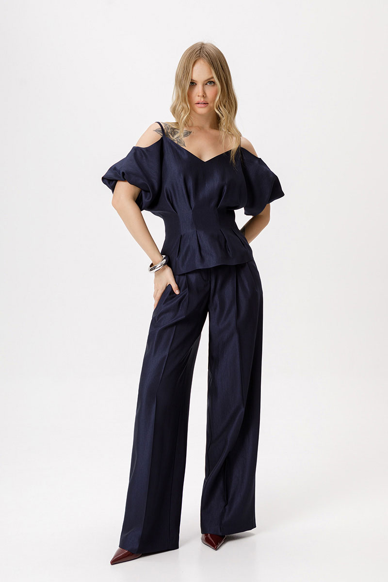 Костюм-двойка из приталенной блузы со складками и широких брюк-палаццо со стрелками.