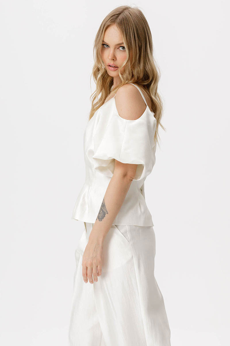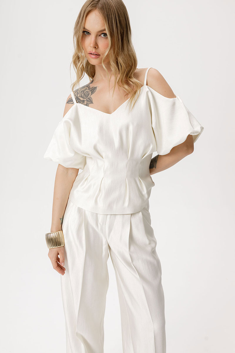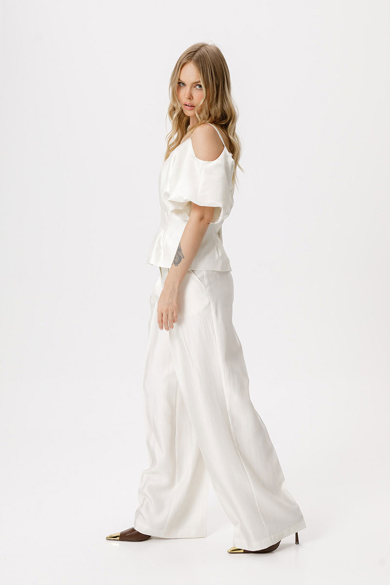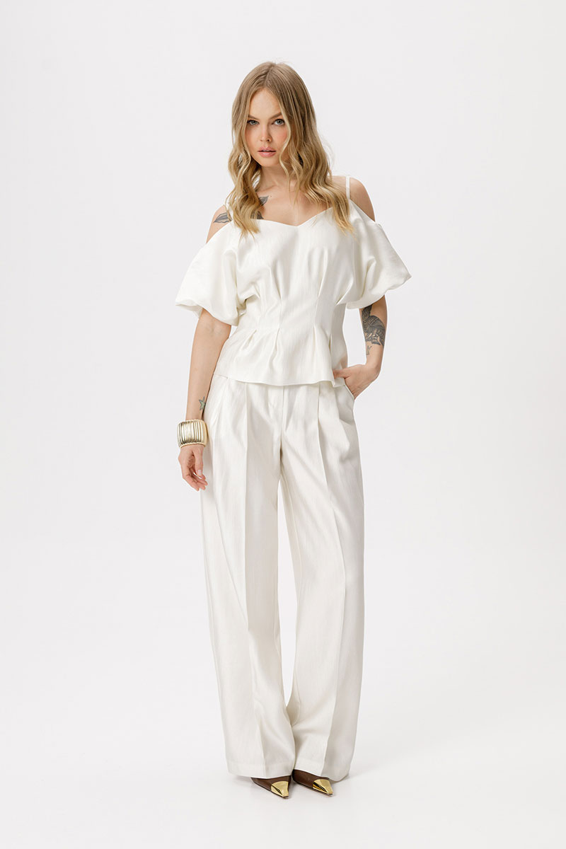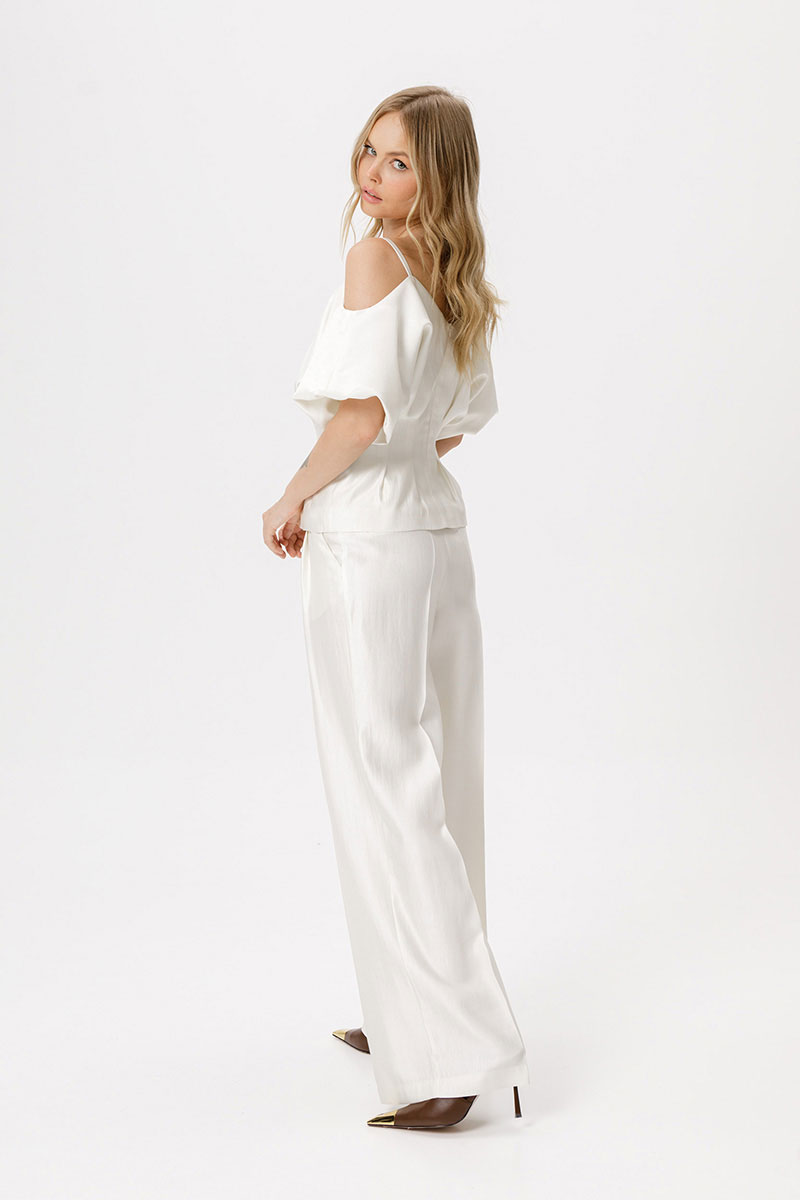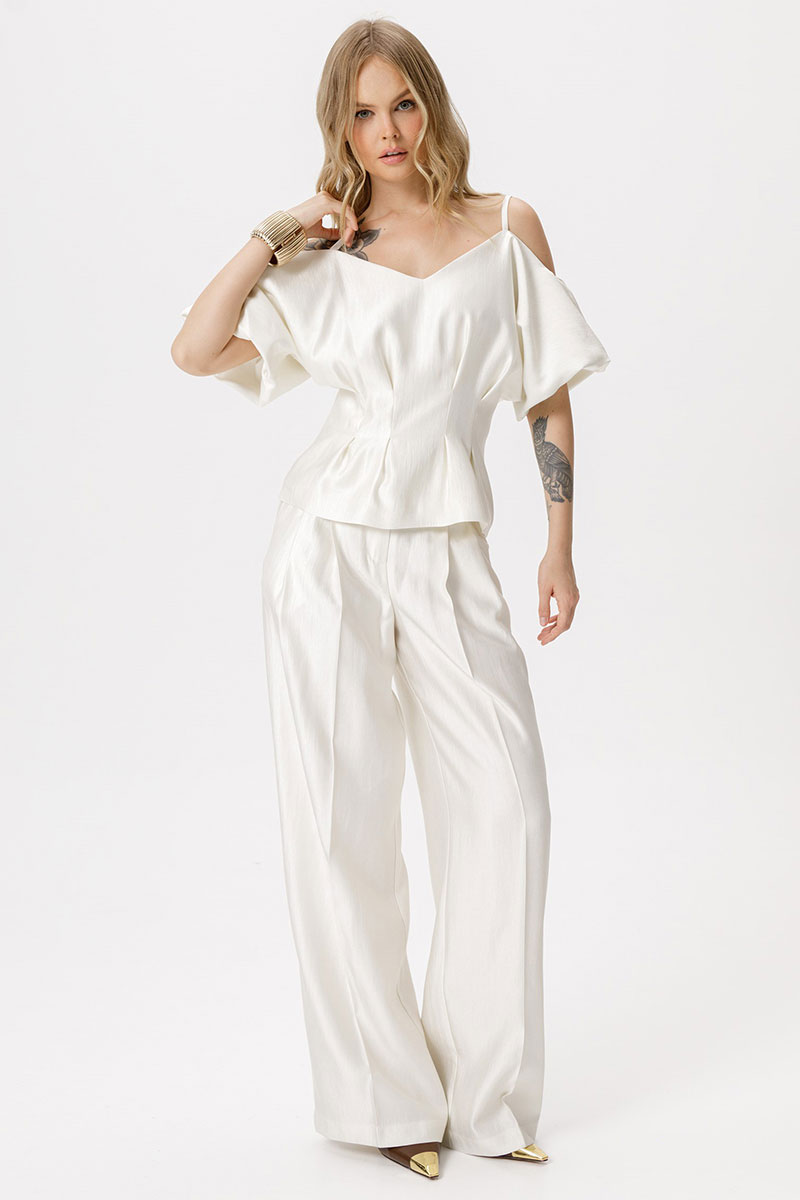 Костюм-двойка из приталенной блузы со складками и широких брюк-палаццо со стрелками.