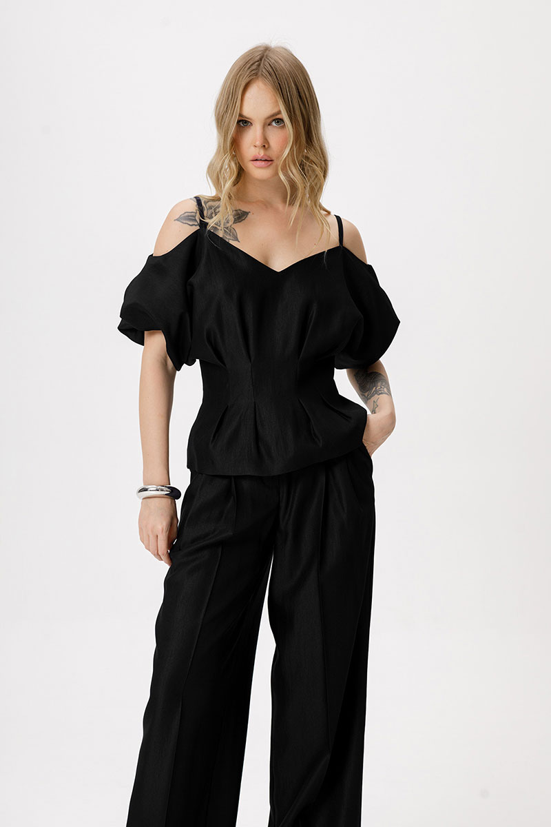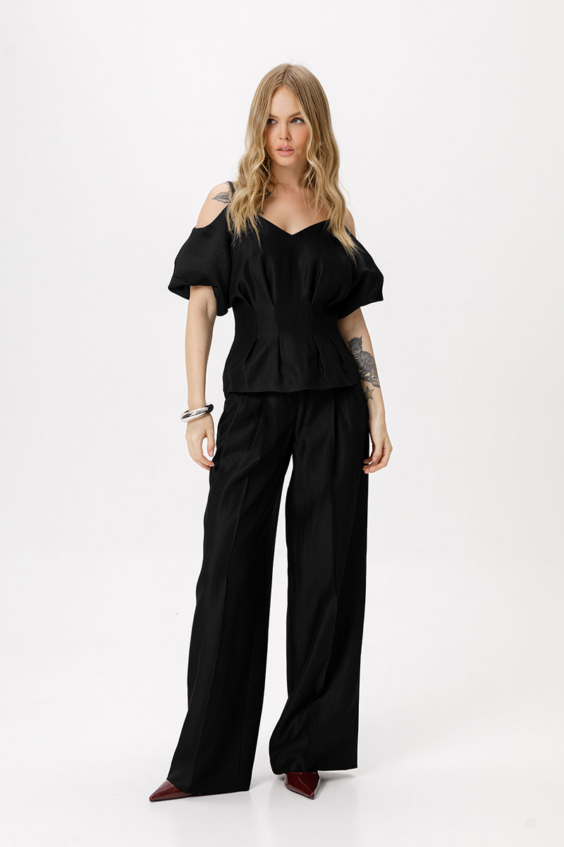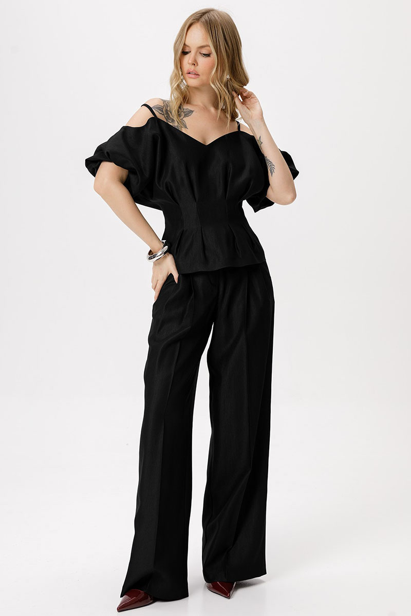 Костюм-двойка из приталенной блузы со складками и широких брюк-палаццо со стрелками.