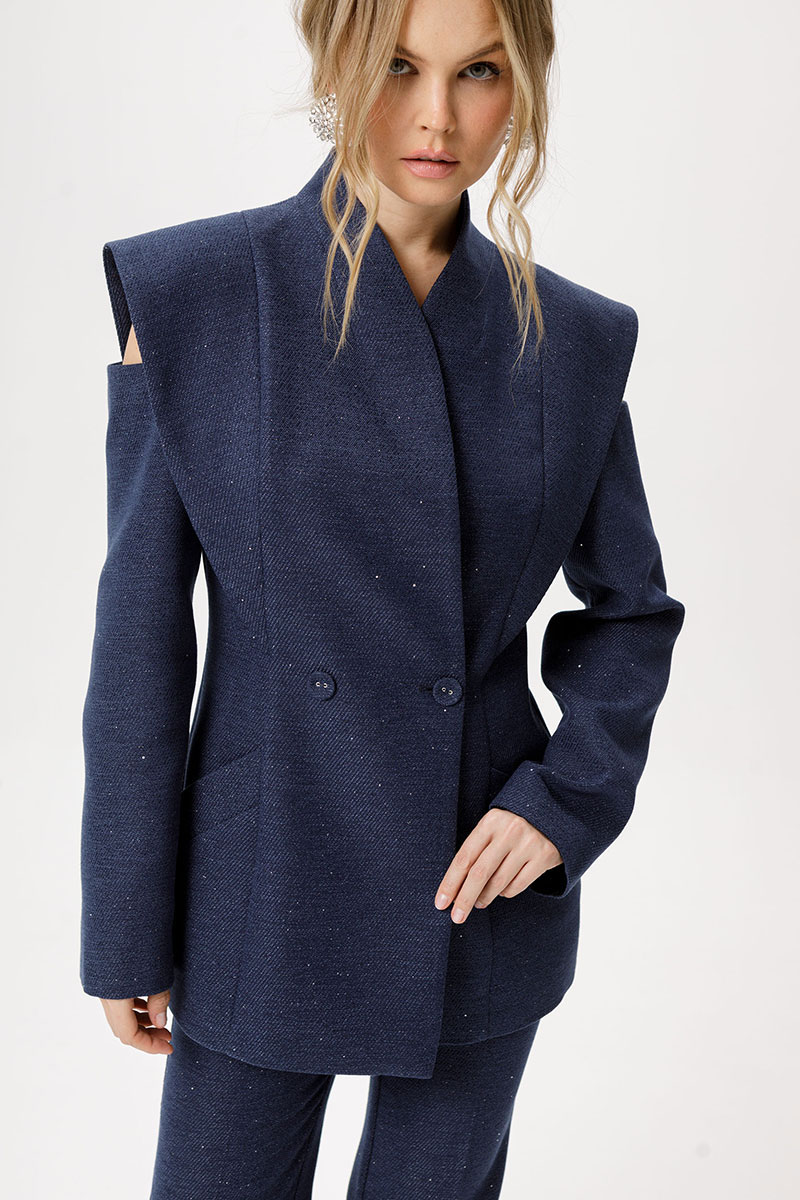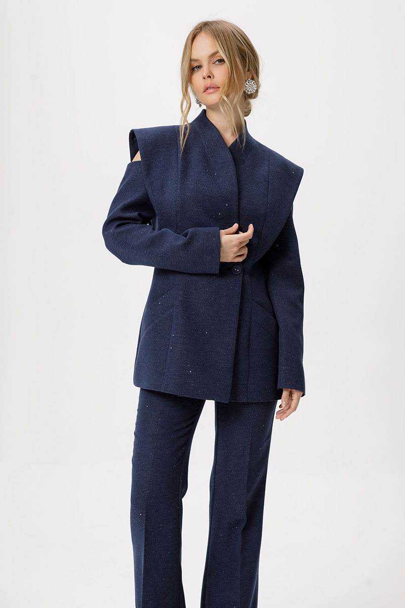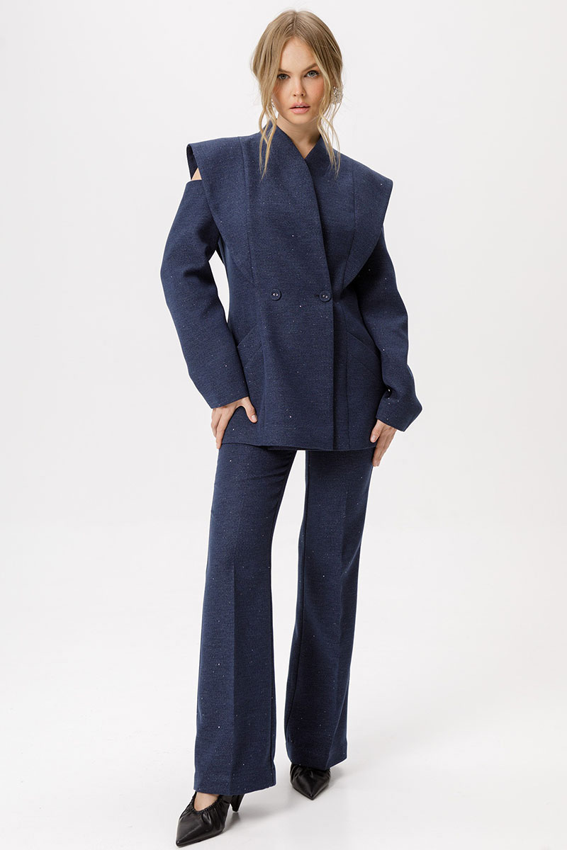 Детали: полуприлегающий силуэт, цельнокроеный воротник-стойка, двубортная застёжка на петли и пуговицы, рельефные швы переда и спинки с декоративным элементом, рукава длинные с вырезами по верху, функциональные карманы, жакет на подкладке. Брюки с притачным поясом со шлёвками, передние половинки с заутюженными стрелками, наклонные карманы, задние половинки с вытачками и заутюженными стрелками, застёжка на молнию и пуговицу с потайным крючком, пояс брюк прямой без резинки.
