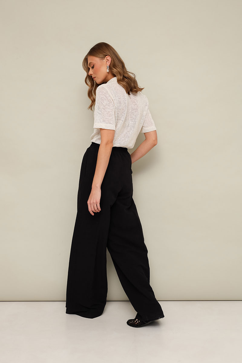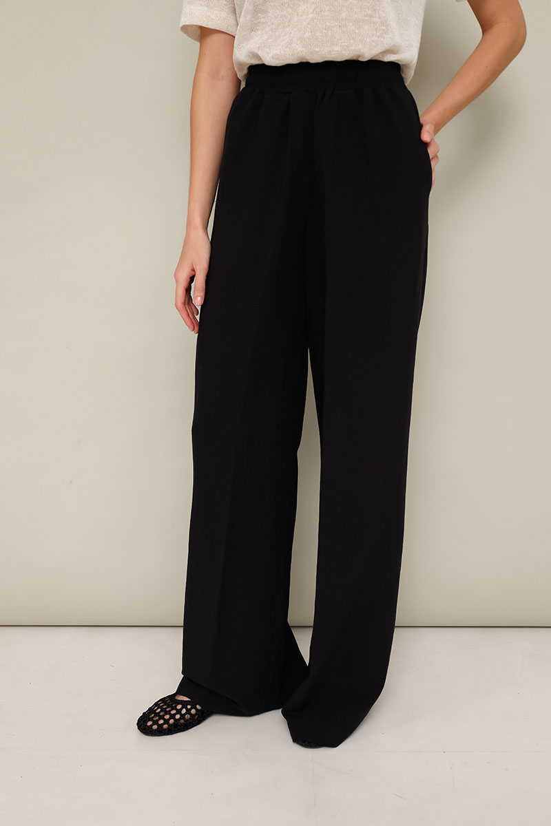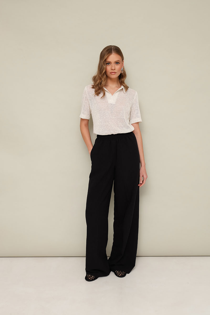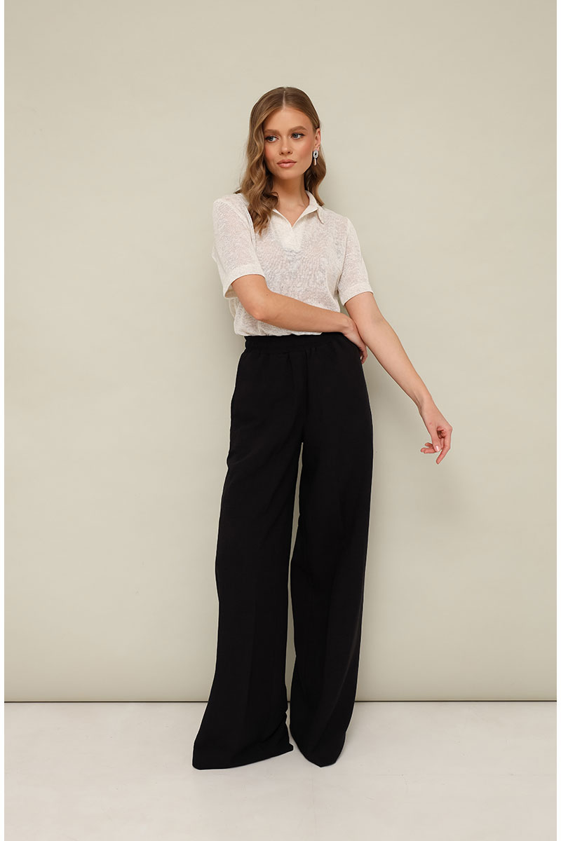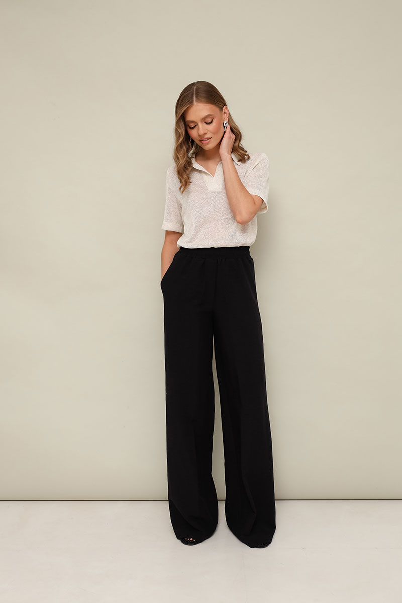 Брюки прямого силуэта с боковыми наклонными карманами, спереди обработана имитация гульфика. Пояс притачной на резинке, для регуляции размера. Длина брюк разработана с учетом усадочных свойств натуральной ткани.