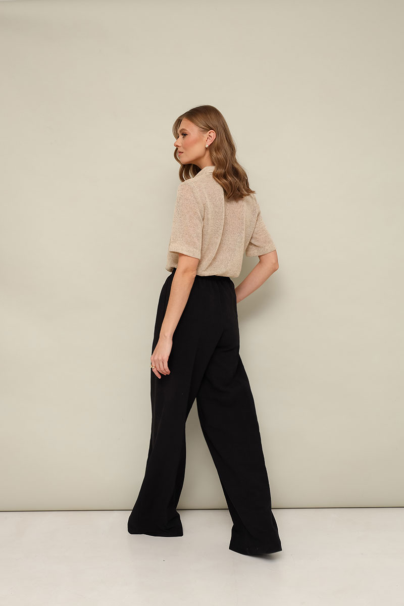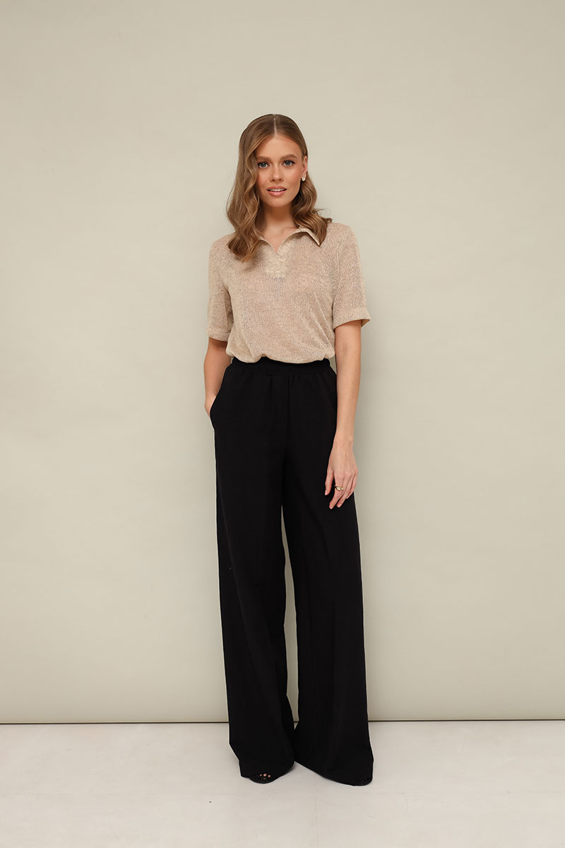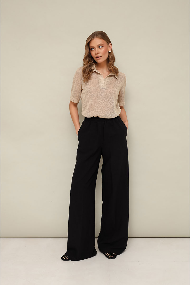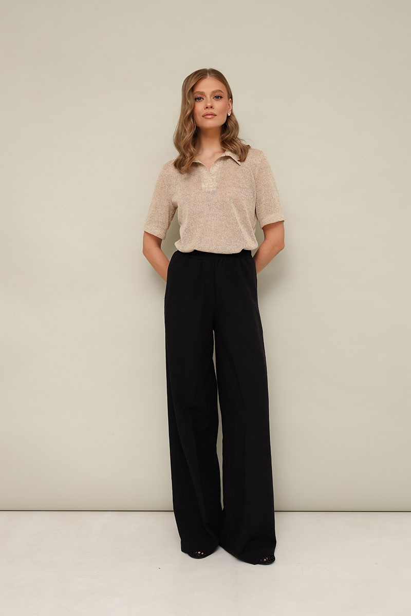 Брюки прямого силуэта с боковыми наклонными карманами, спереди обработана имитация гульфика. Пояс притачной на резинке, для регуляции размера. Длина брюк разработана с учетом усадочных свойств натуральной ткани.