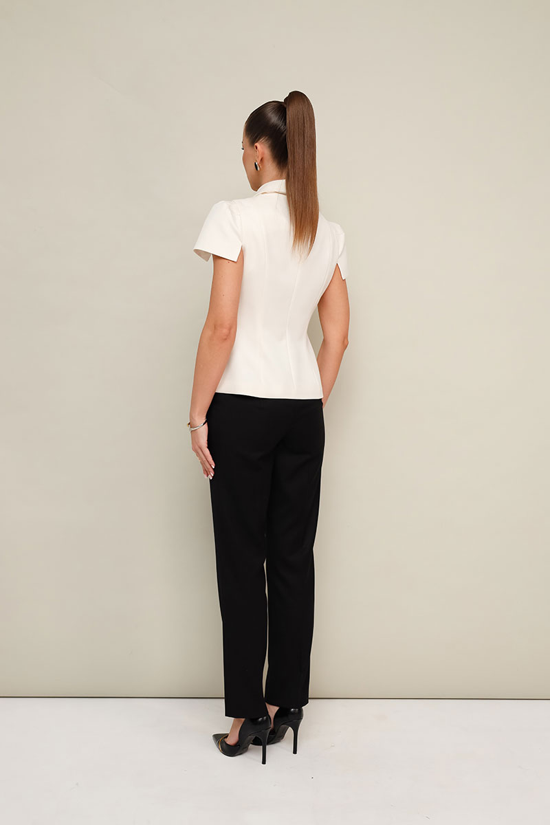 Жакет полуприлегающего силуэта, с центральной застежкой на петли и пуговицы. Отложной воротник со стойкой. Рукава короткие с вытачками по окату и разрезами по низу. Жакет на подкладке.