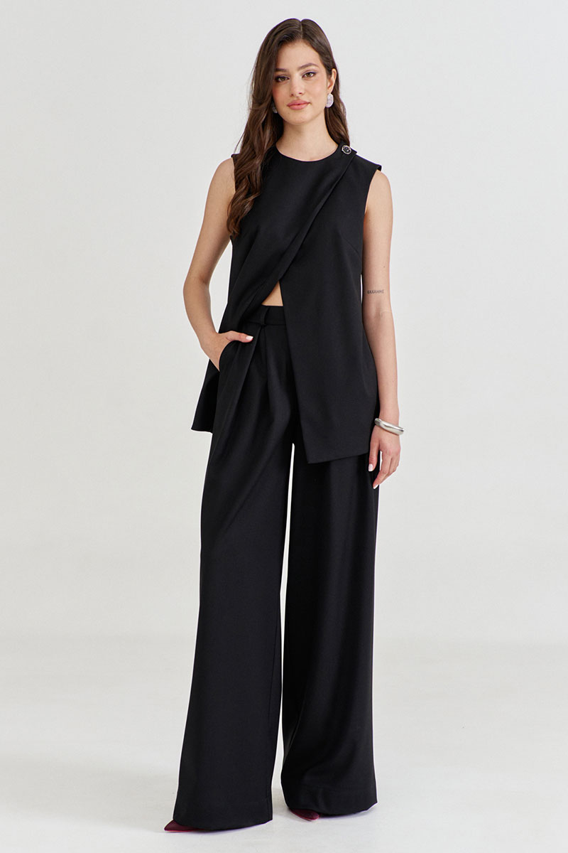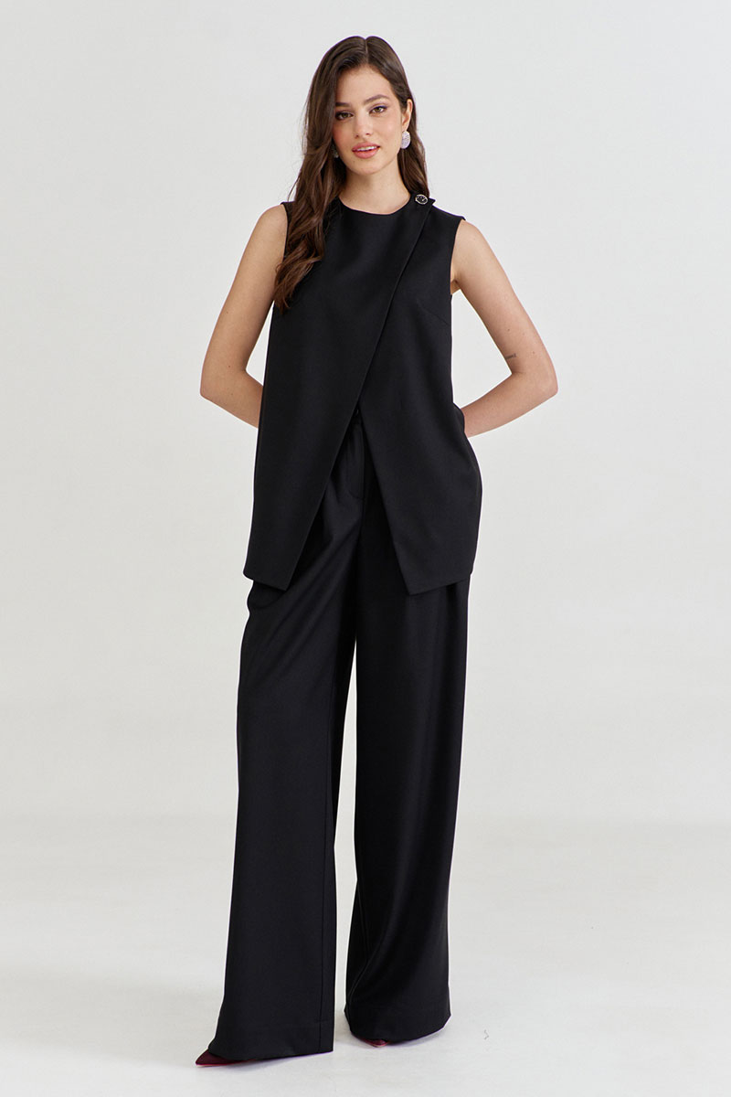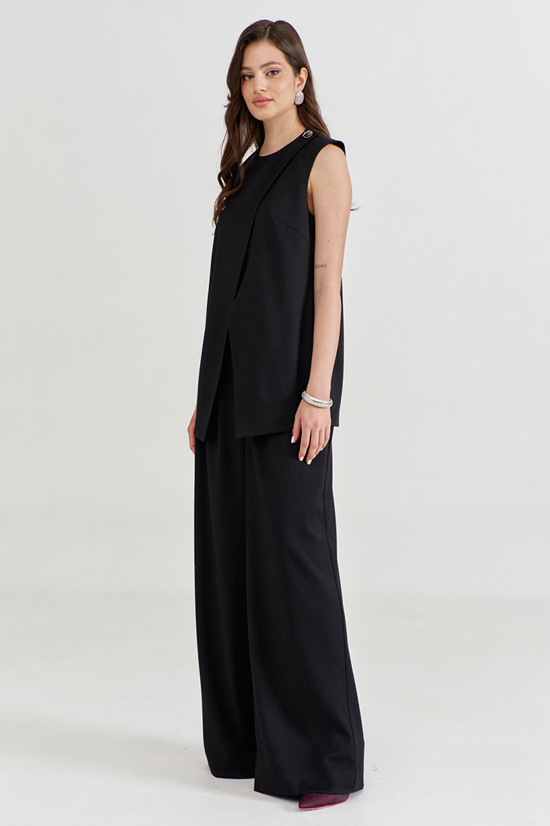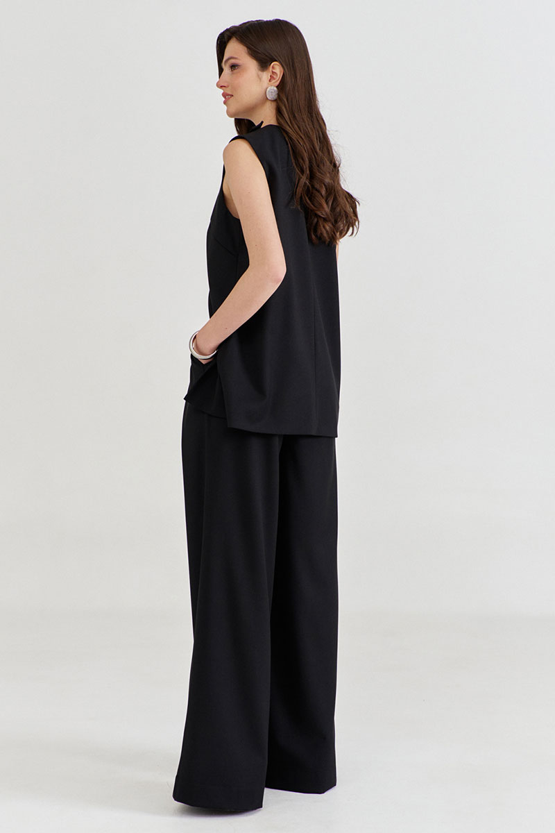 Жилетка свободного кроя, длиной ниже линии бедер. Спинка со средним швом. Перед выполнен на запах, с нагрудными вытачками. Горловина округлой формы, без воротника. Застежка по переду на петлю и декоративную пуговицу на левом плече и потайную – на правом. Жилетка на подкладке.