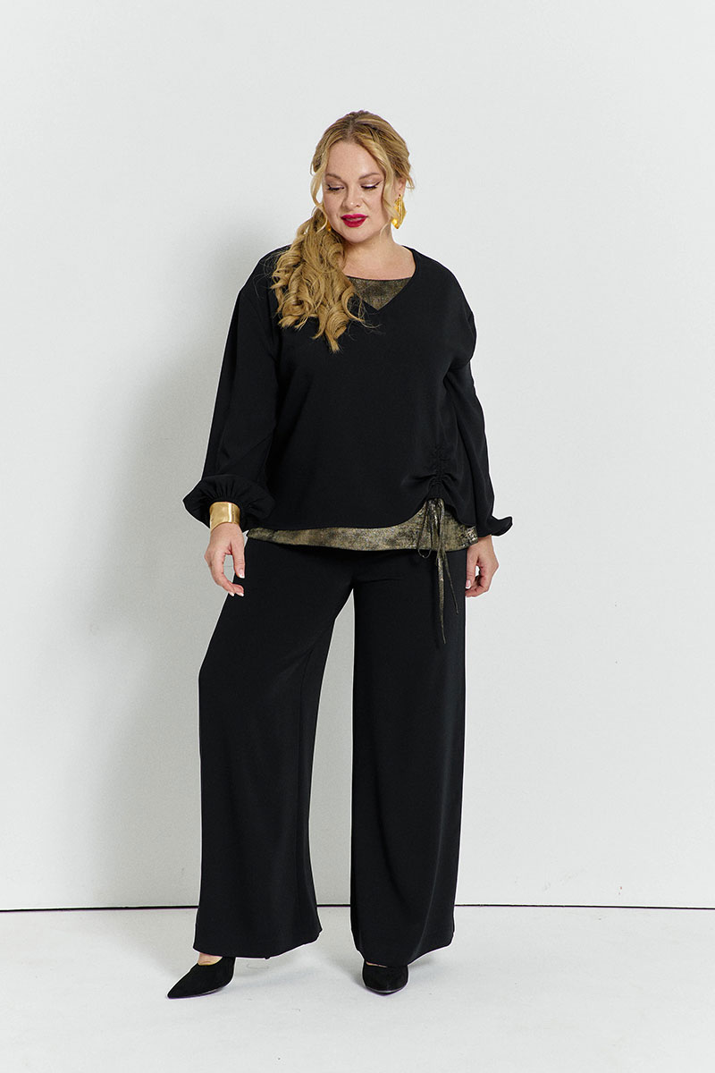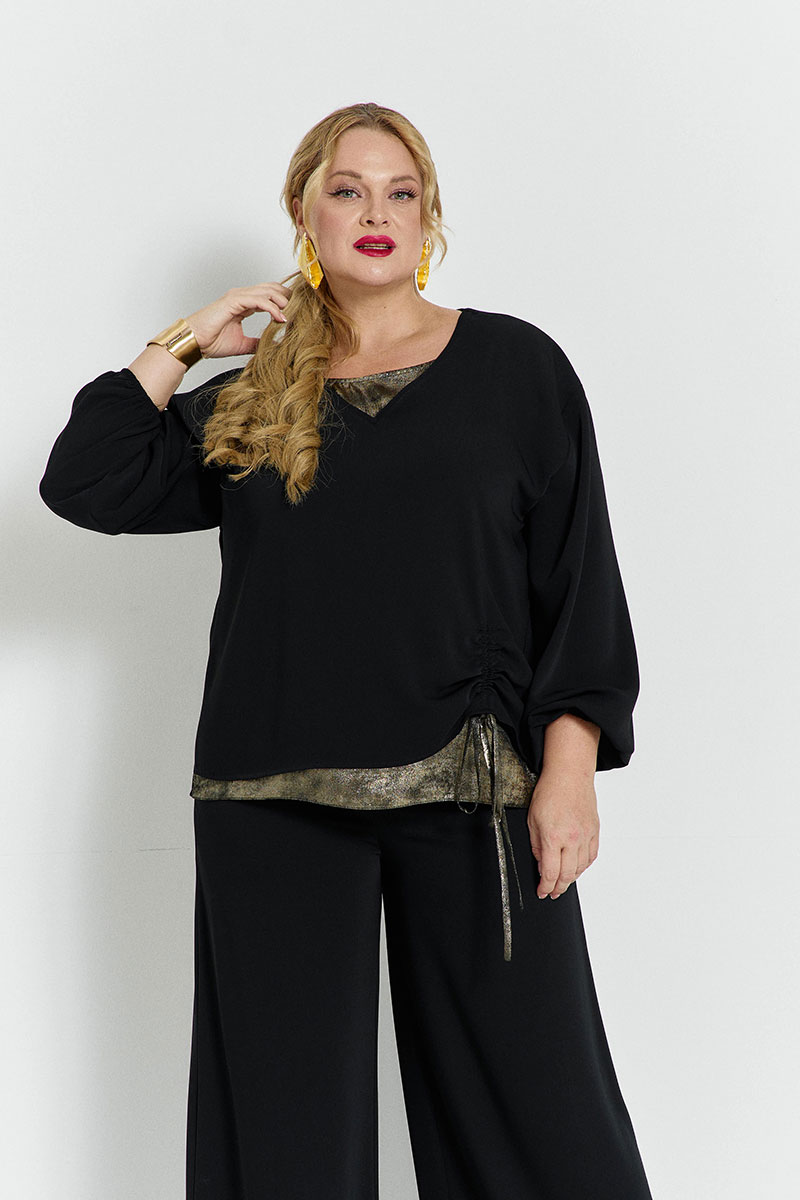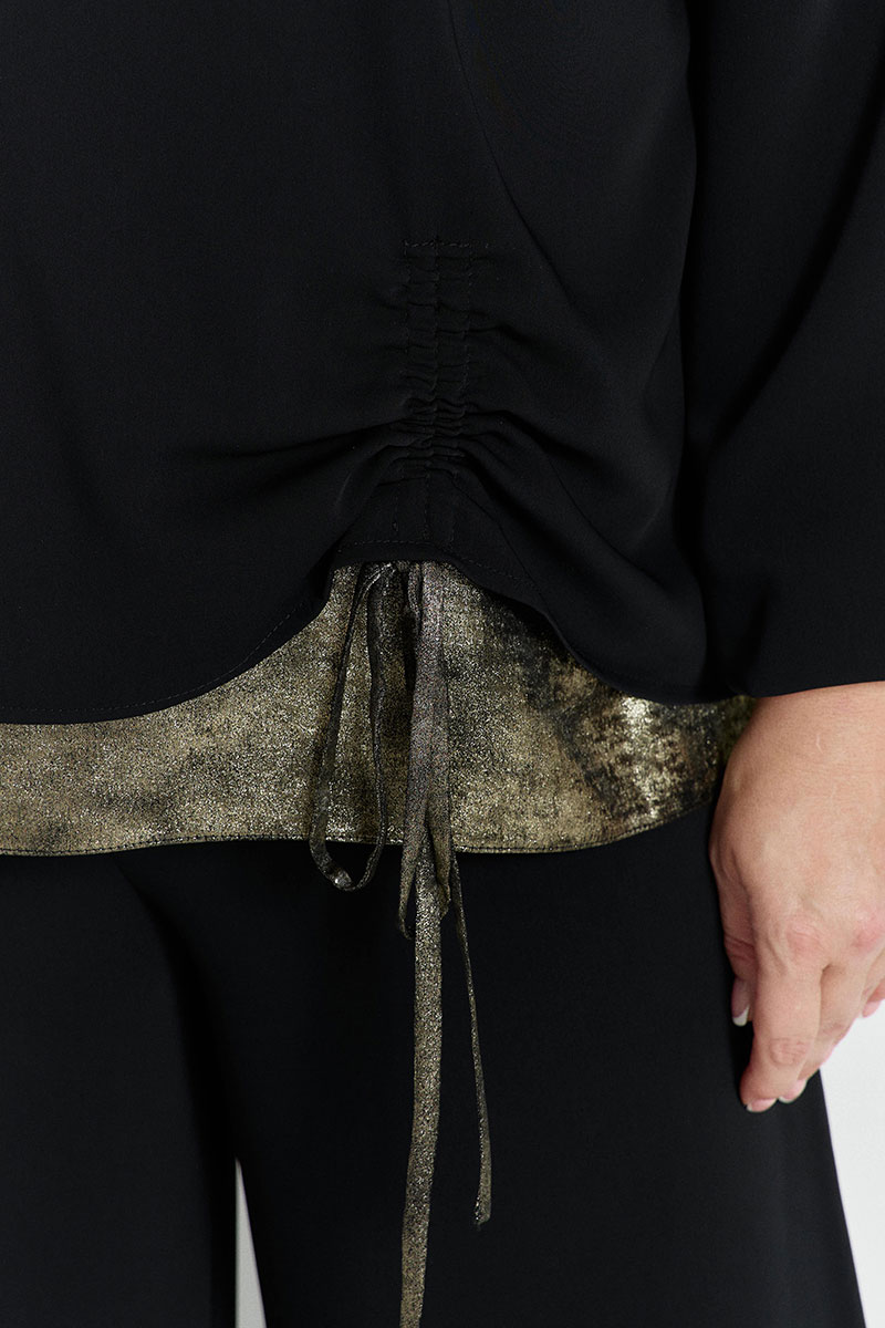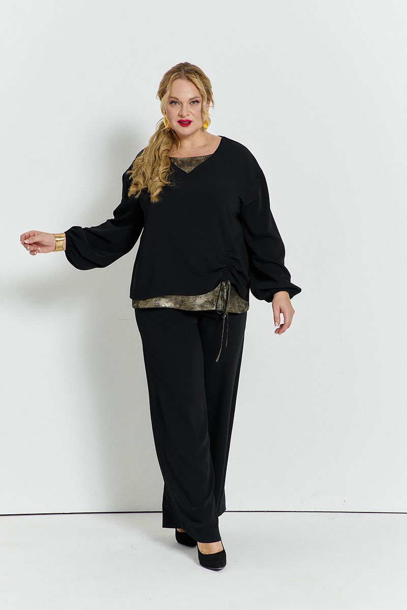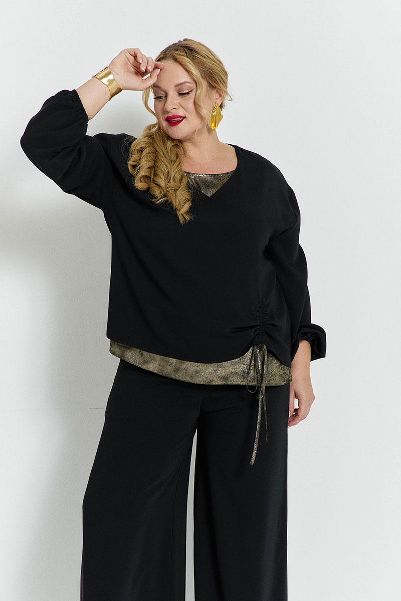 Блуза объёмная, с мягкой линией плеча. V-образный вырез горловины. Подклад переда из другой ткани. Верхняя деталь переда присобирается на кулисе. Низ рукавов на резинке.