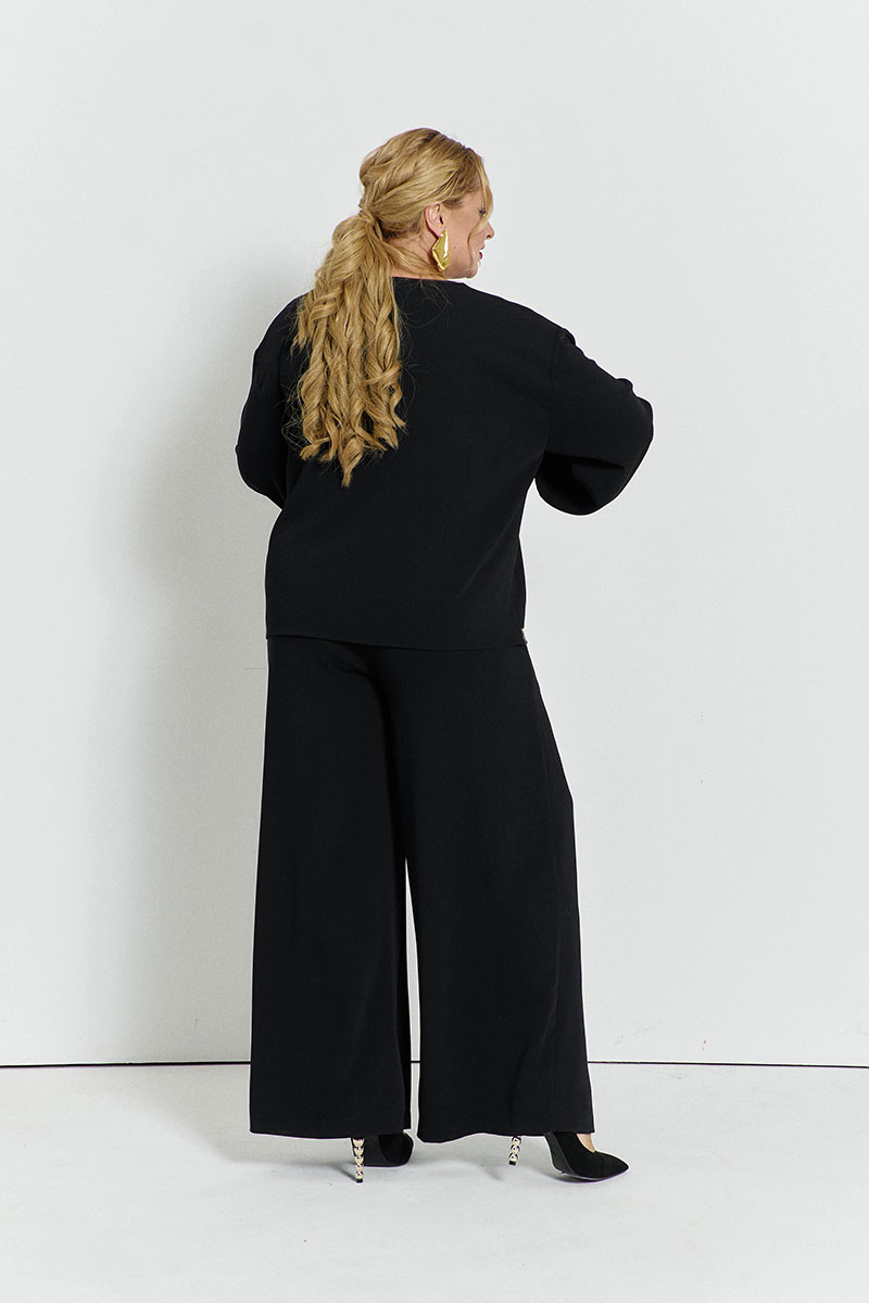 Прямые, широкие брюки с карманами спереди и на поясе с резинкой.