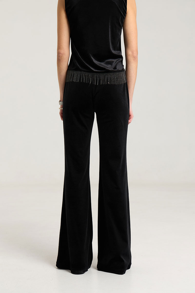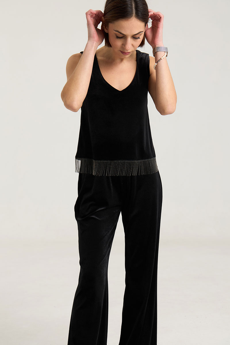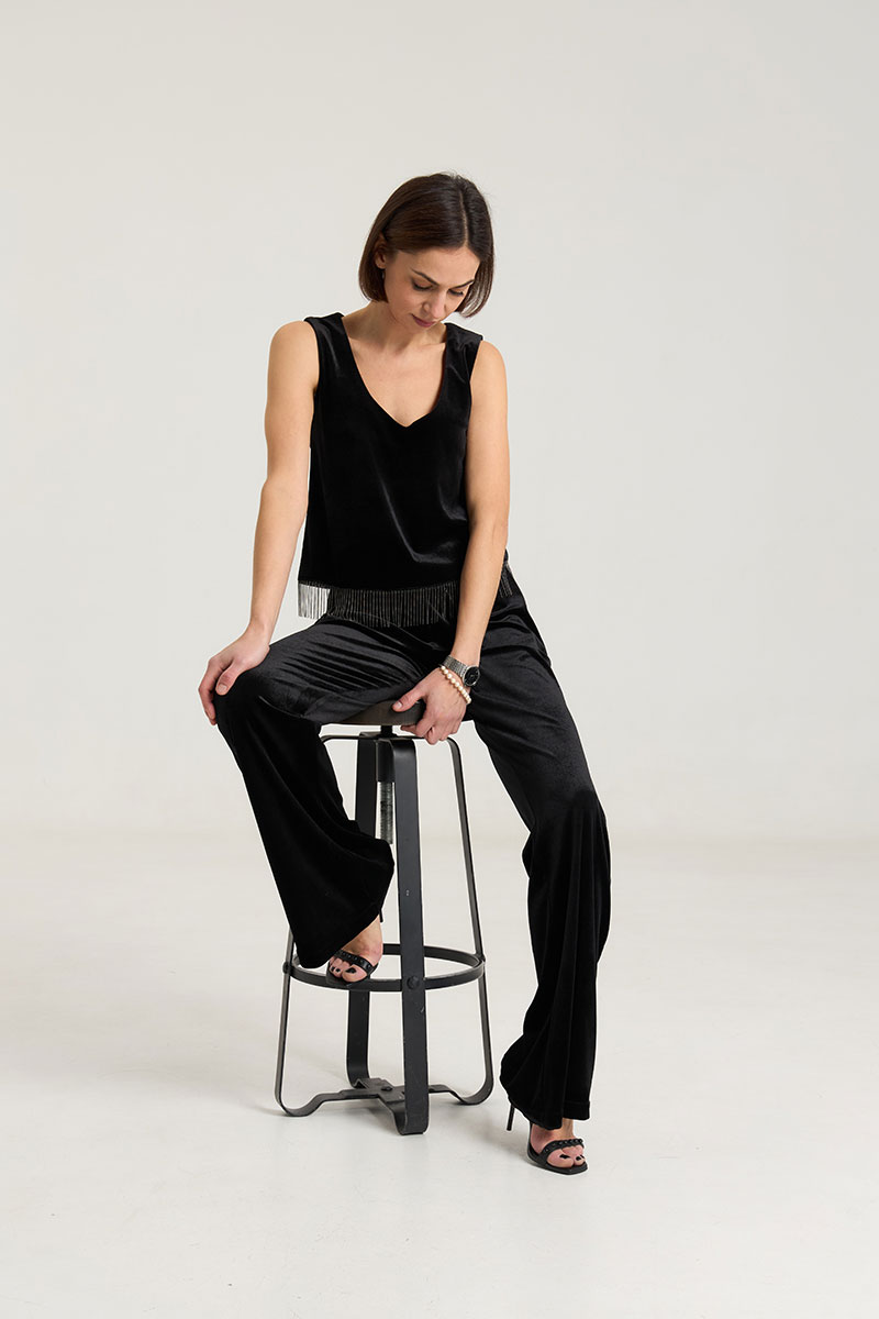 Комплект из топа и брюк.Брюки расклешенные свободного кроя из велюровой ткани - это не только модель для праздника. Талия высокая, брюки на резинке.