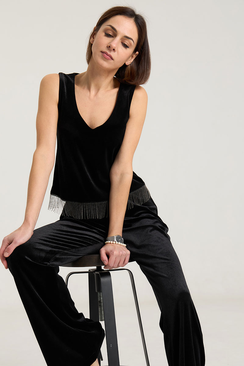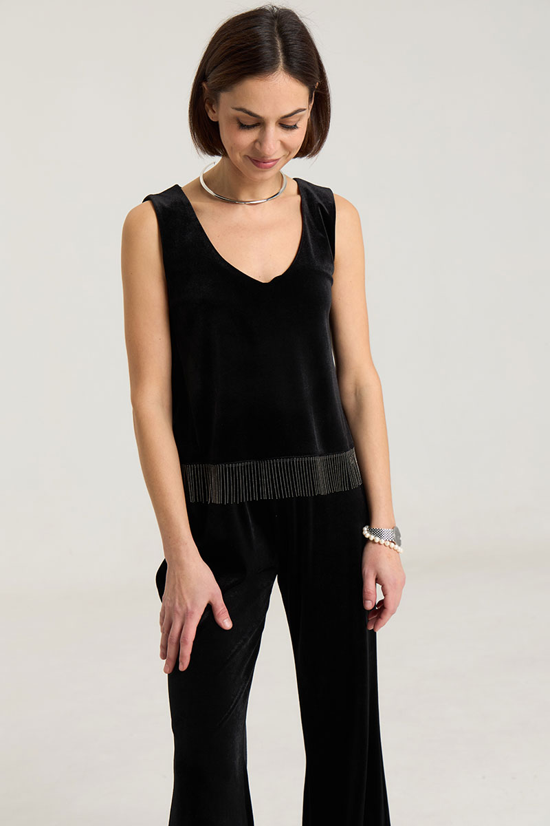 Топ свободного кроя выполнен из велюровой ткани черного цвета, на обтачке по переду и спинке, с углубленным вырезом. Рост модели на фото 168 см.