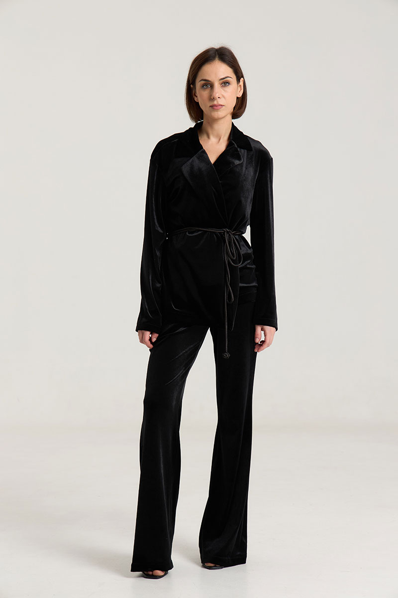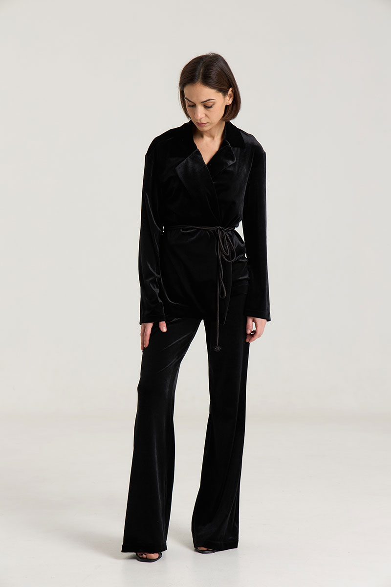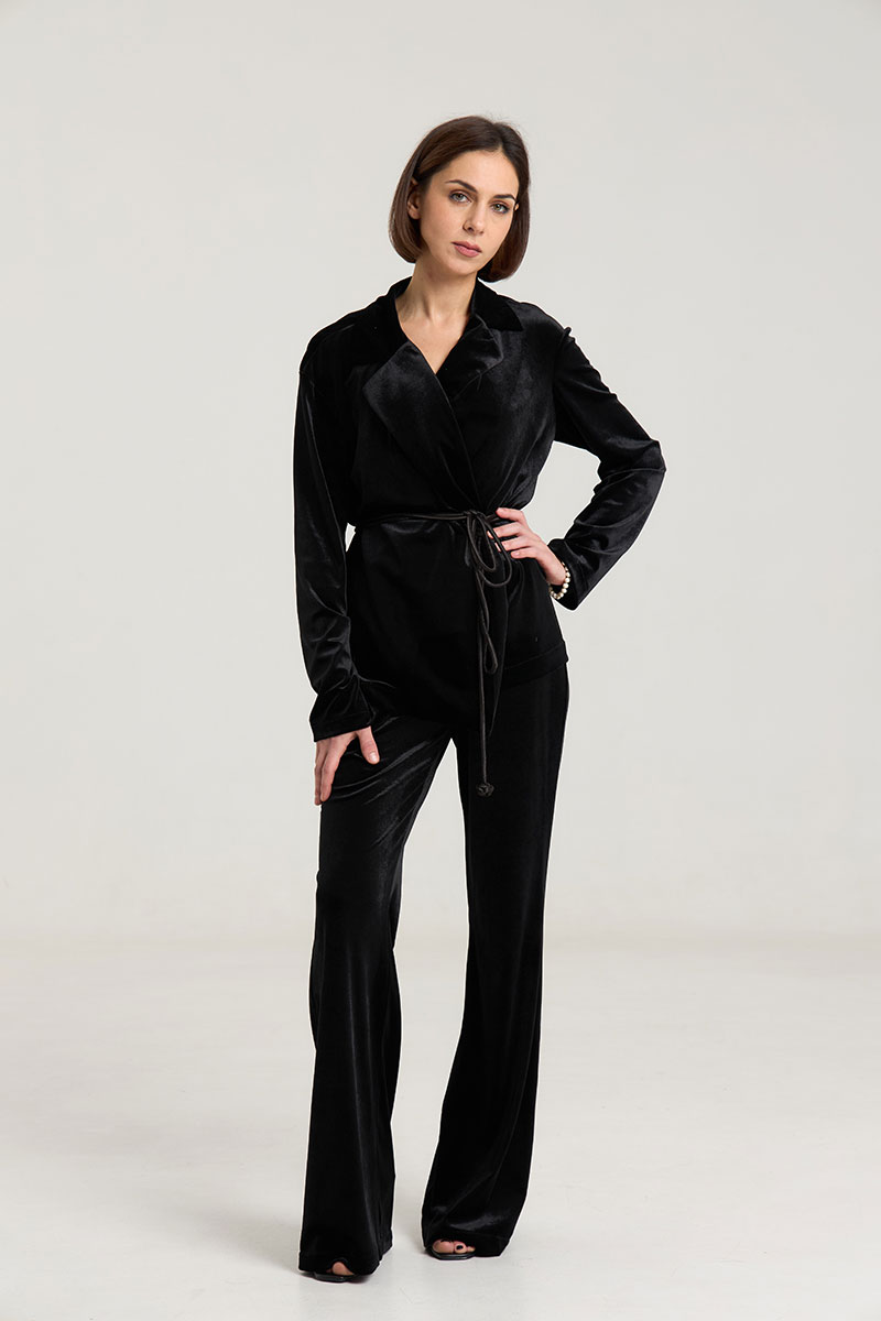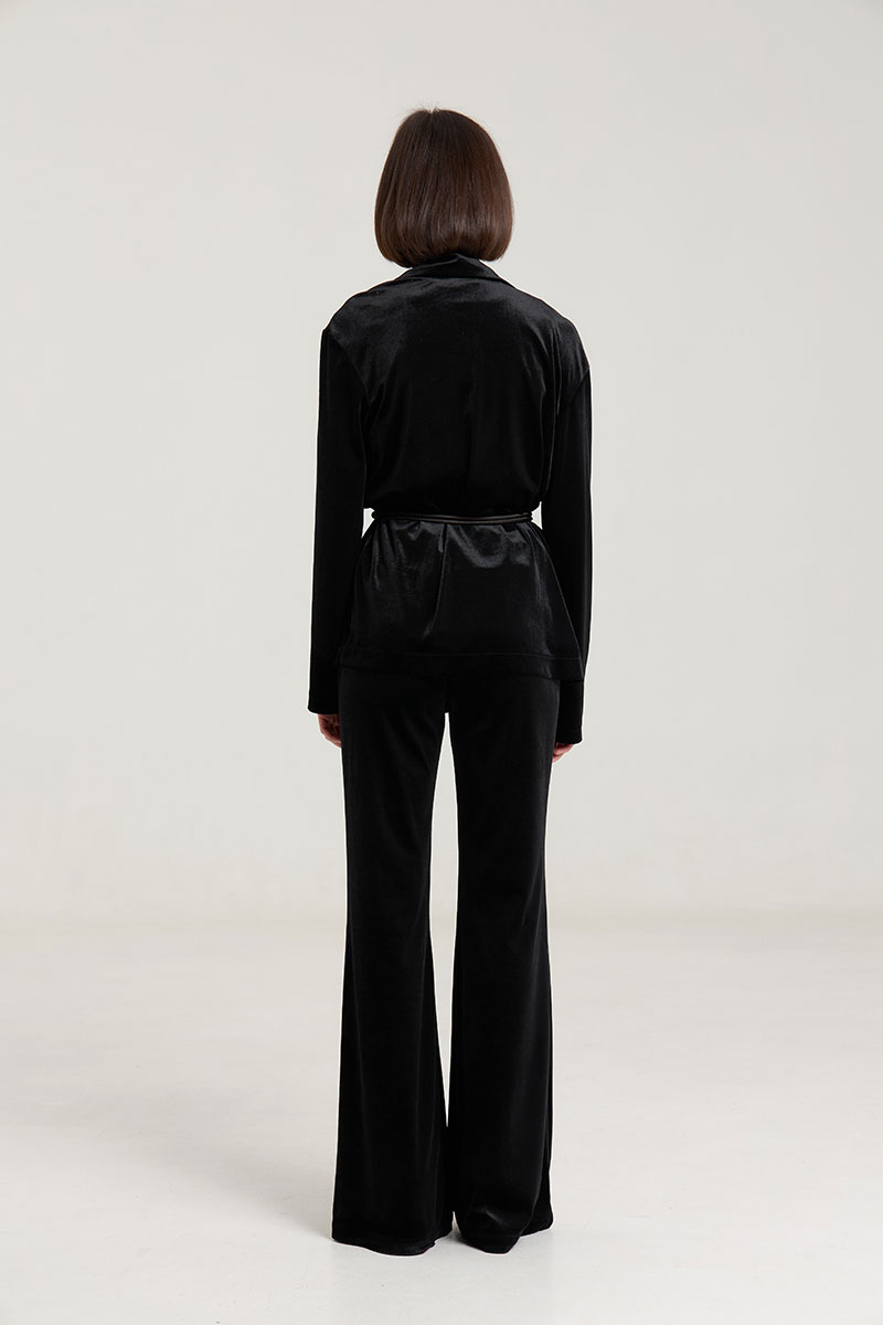 Костюм из жакета и брюк..Жакет прямого кроя на запах под декоративный пояс- шнур,без пуговиц, без покладки , спинка без среднего шва. Отделочные строчки по борту воротника и поясу на 0,7 мм. Брюки расклешенные свободного кроя из велюровой ткани. Талия высокая, брюки на резинке.