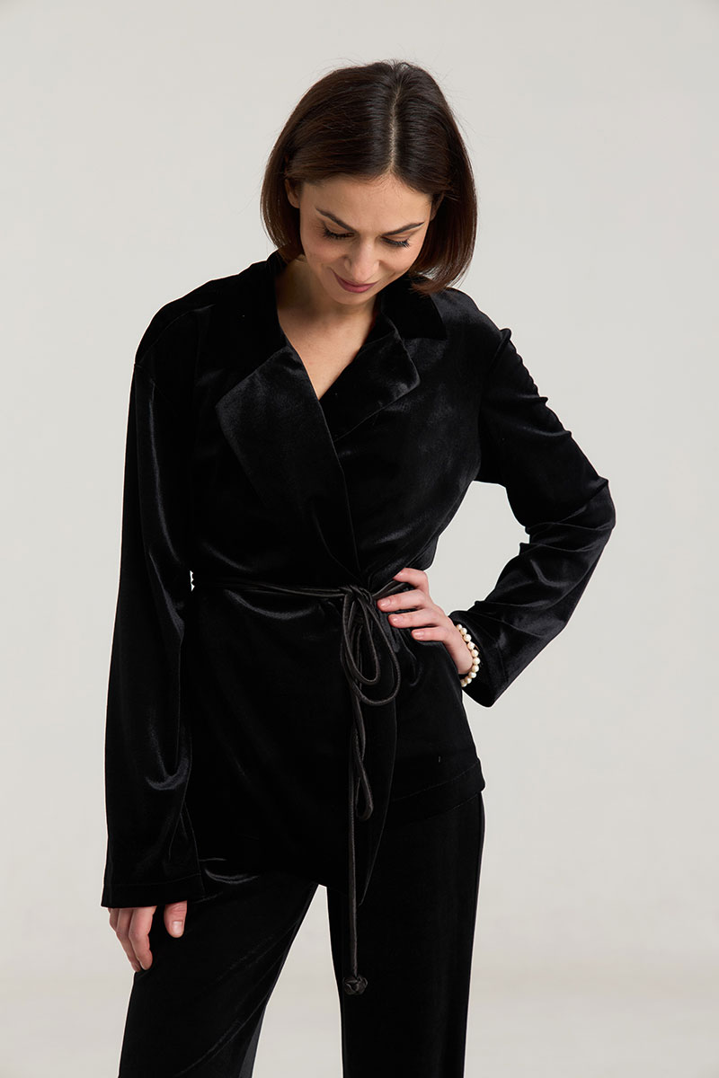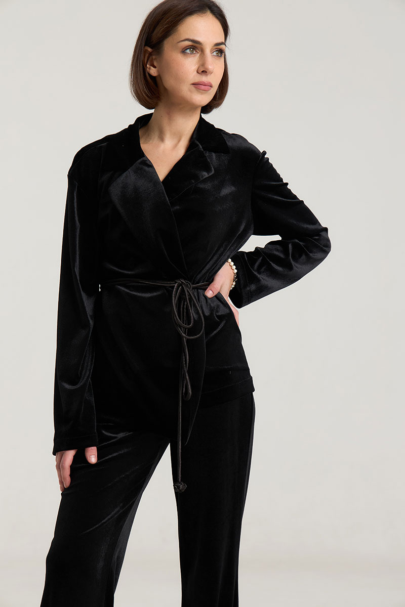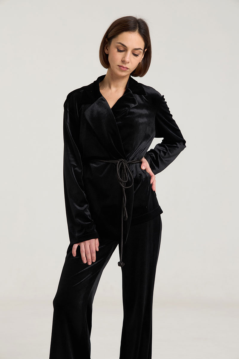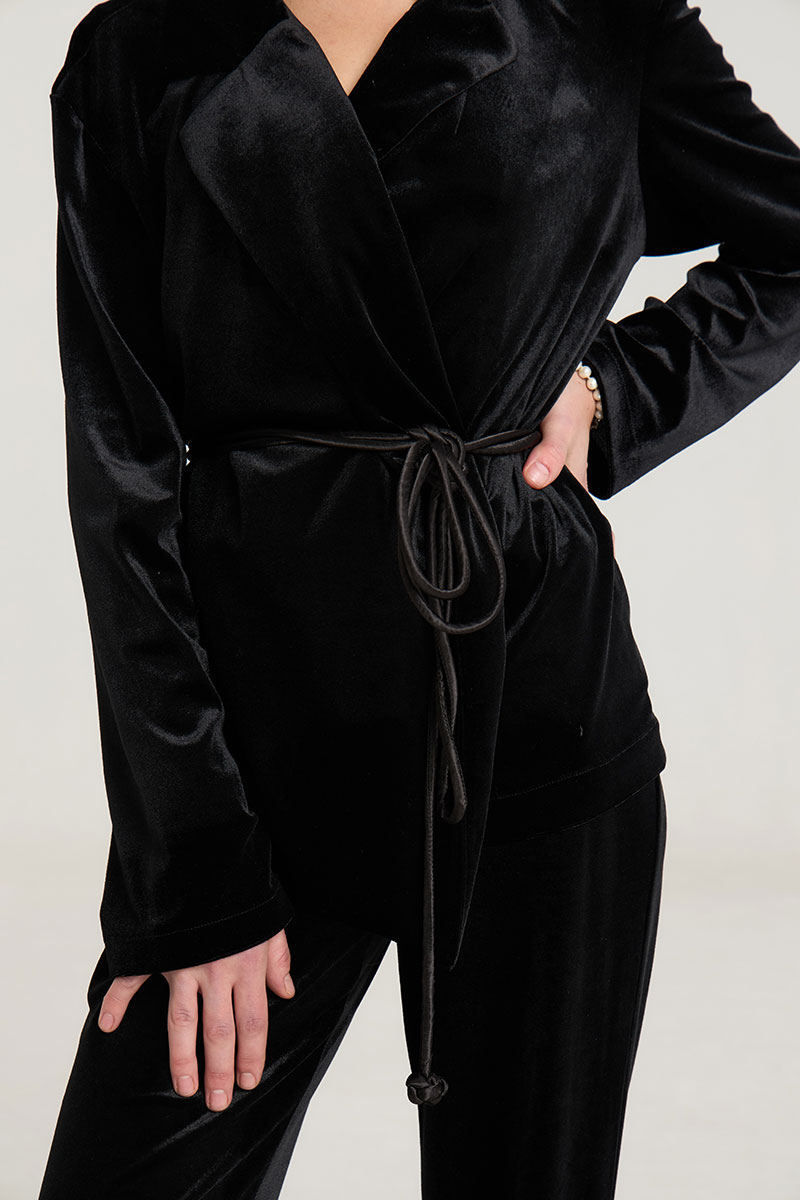 Костюм из жакета и брюк..Жакет прямого кроя на запах под декоративный пояс- шнур,без пуговиц, без покладки , спинка без среднего шва. Отделочные строчки по борту воротника и поясу на 0,7 мм. Брюки расклешенные свободного кроя из велюровой ткани. Талия высокая, брюки на резинке.