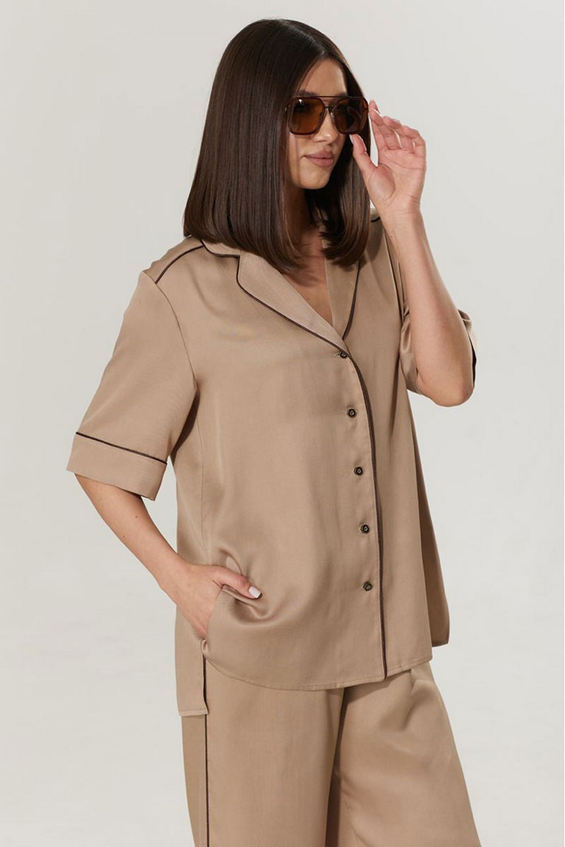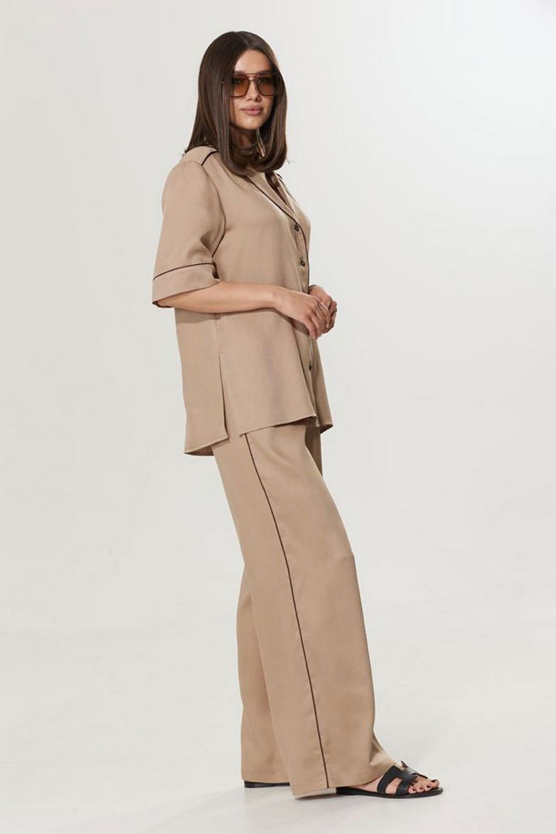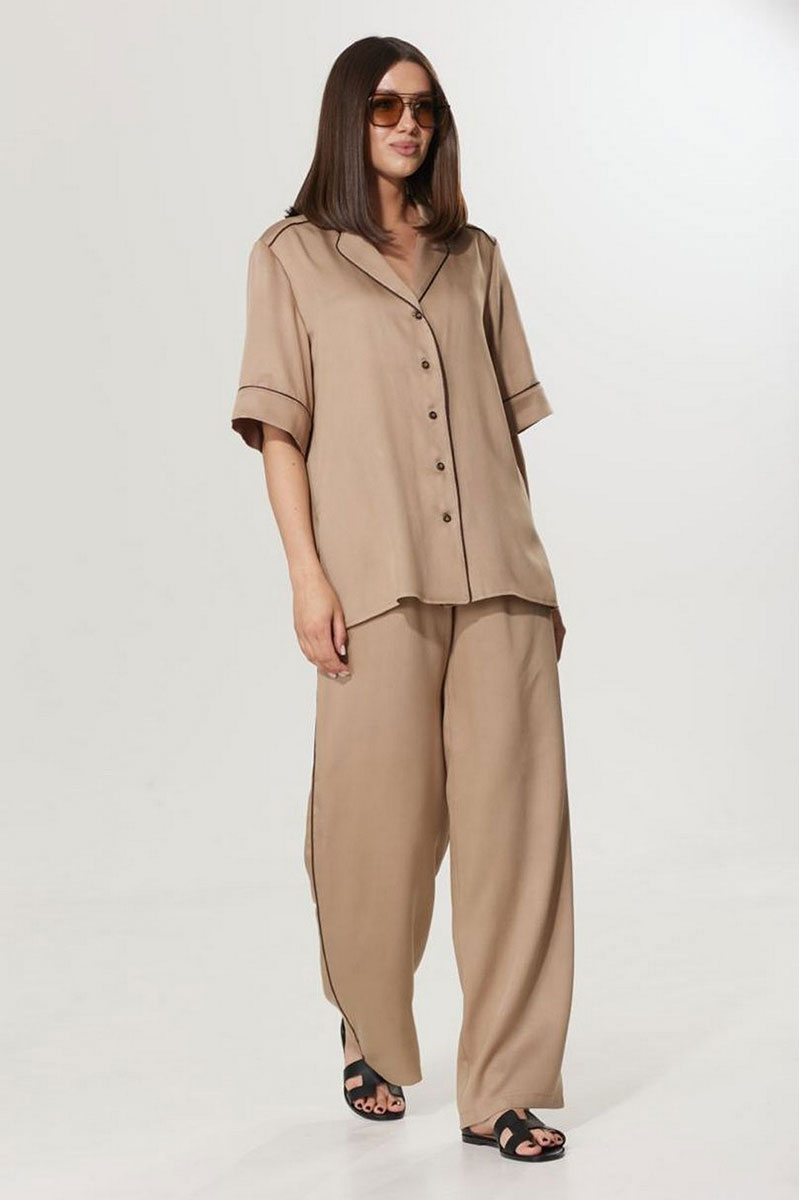 Летний брючный комплект в пижамном стиле из струящейся сатиновой ткани — это воплощение лёгкости, комфорта и утончённой элегантности. Комплект, состоящий из свободной рубашки с короткими рукавами и прямых брюк, идеально подходит для жарких дней, даря ощущение невесомости и позволяя создавать непринуждённые, но выразительные образы. В комплект входит рубашка с короткими рукавами и брюки.