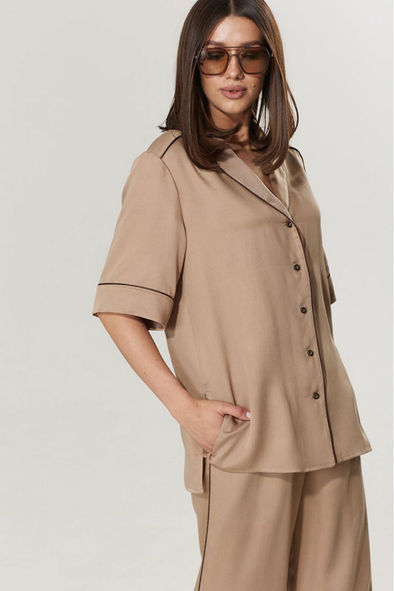Рубашка свободная, прямого силуэта. Застежка центральная на петли и пуговицы. Горловина V-образной формы с рубашечным отложным воротником. Рукав короткий втачной, одношовный, чуть расклёшенный к низу. По низу боковых швов рубашки разрезы. По рукавам, краям воротника и центру полочки вставлен декоративный кант. Спинка прямая, без среднего шва.