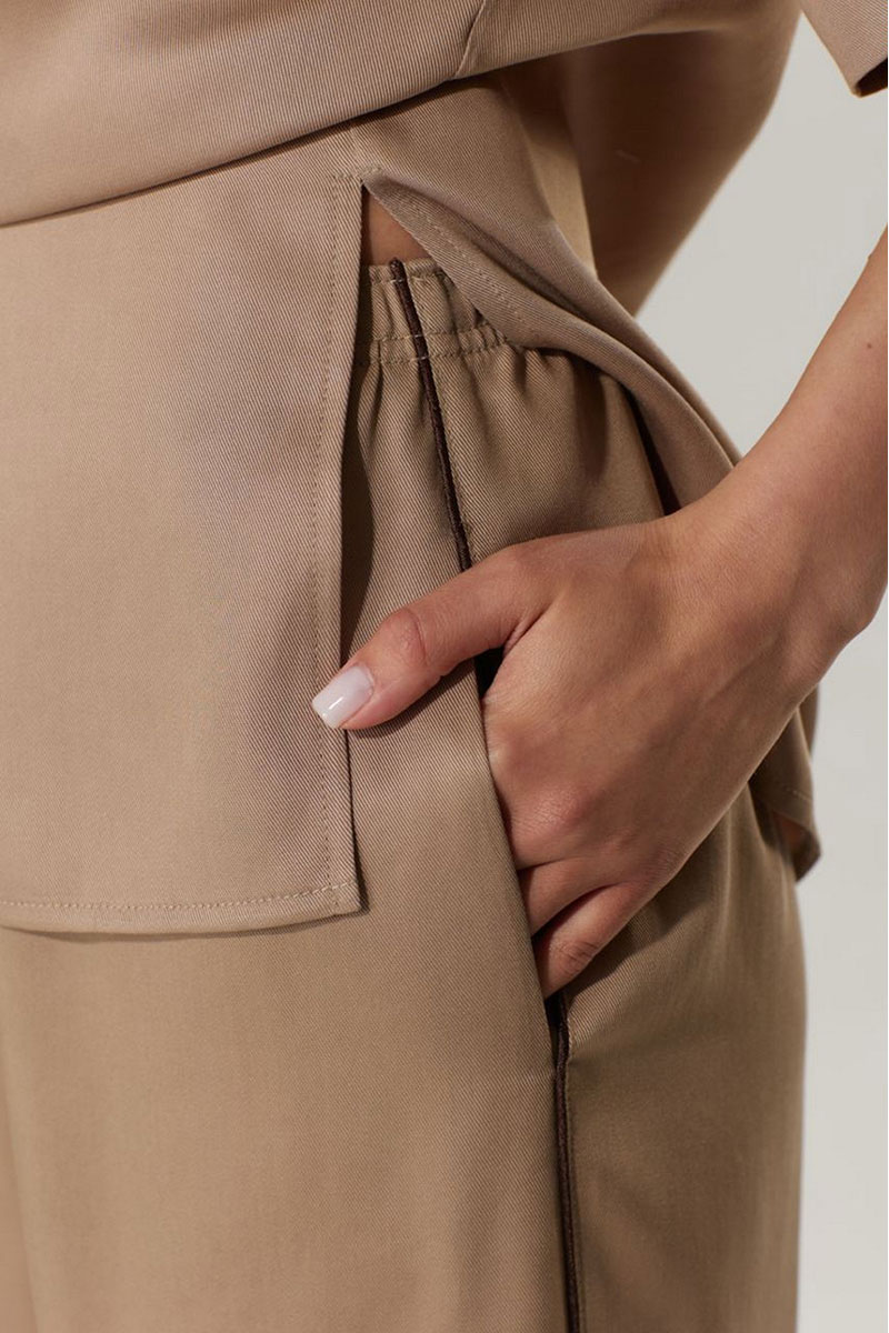 Брюки прямого силуэта, верх на резинке. В боковом шве брюк декоративный кант.
