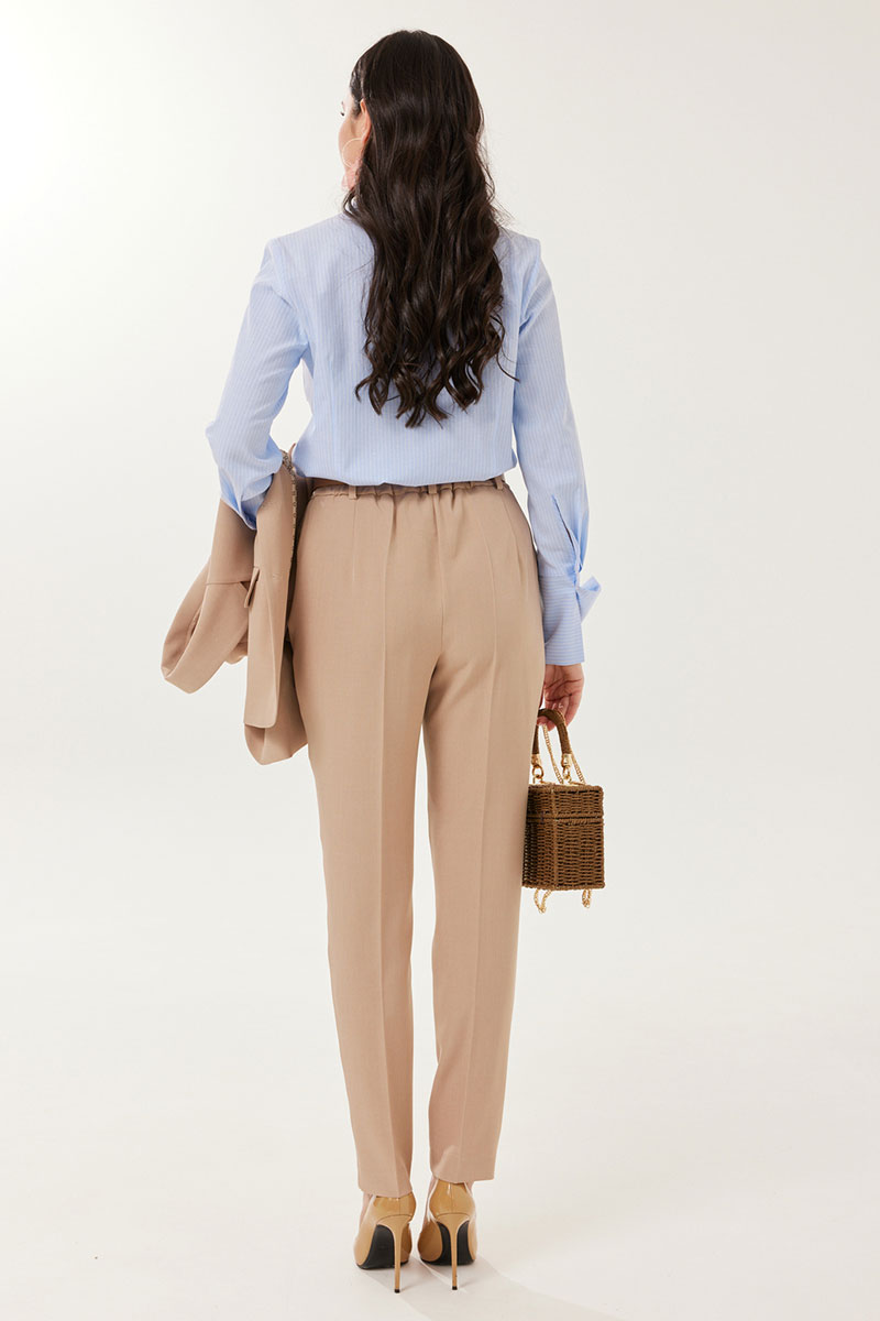 Брюки классической формы, слегка заужены к низу, со стрелками по передним и задним половинкам. Верхний срез обработан притачным поясом, по спинке вставлена резинка для регулировки обхвата талии. По центру переда - застёжка на крючок и тесьму молнию. На задних половинках расположены талиевые выточки, в боковых швах расположены наклонные карманы.